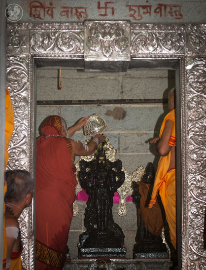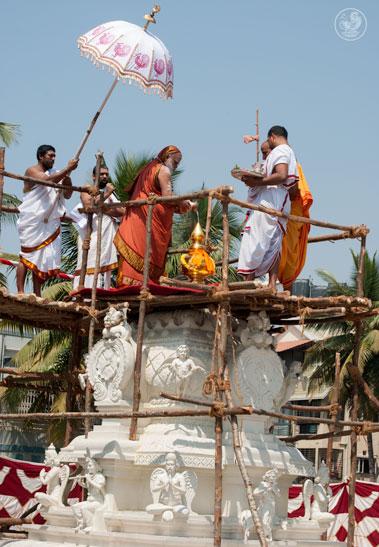 Earlier, enroute to the Mandiram, the Jagadguru had visited the Shanmukhaswamy temple at Rajarajeshwari Nagar, where He had performed the Prathishta Kumbhabhisheka in 2007.