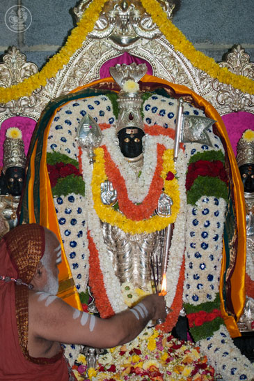 When the procession accompanying the Jagadguru reached the premises of the Sringeri Shankara Math, Shankarapuram, the Jagadguru had Darshan of Goddess Sharada (consecrated in 1939 by His Paramaguru) and Sri Adi Shankaracharya (consecrated in 1907 by His Parameshti Guru). Dhuli Pada Puja was performed by Sri V R Gowrishankar, Administrator & CEO of the Peetham. Karnataka Chief Minister, Sri Sadananda Gowda spoke on the occasion and offered a reverential welcome to the capital city on behalf of the 6.5 crore people of Karnataka. Sri Arun Kumar, Member of Parliament, in his speech stated that the Sringeri Jagadguru is the Meru Purusha of Sanatana Dharma and sought His Blessings for the welfare of all.