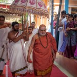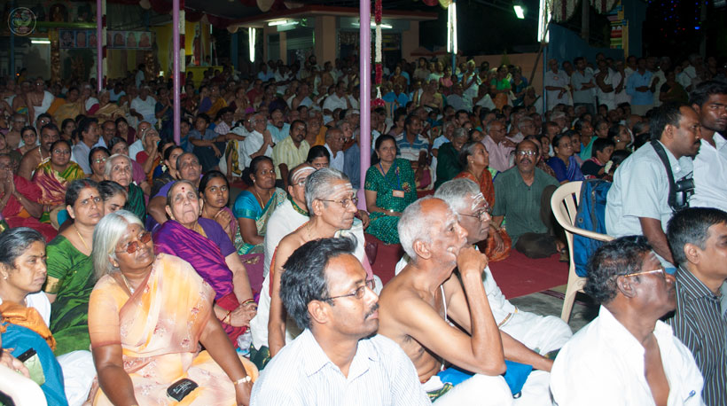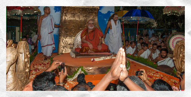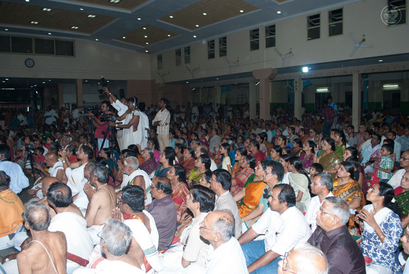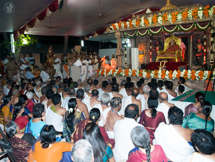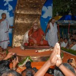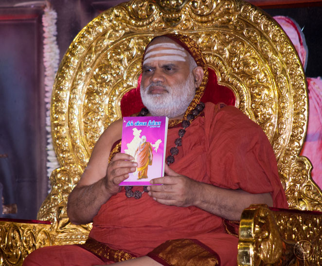 The Jagadguru also said He was essentially a Sannyasi and as a Peethadhipati. The Mahaswamiji also quoted the Bhagavad Gita- न प्रहृष्येत्प्रियं प्राप्य नोद्विजेत्प्राप्य चाप्रियम् (the Jnani neither rejoices having obtained what is likeable, nor sulks having obtained what is detestable). His duty was to adhere to the tenets of Dharma and Vedanta and to talk only about these topics when speaking in public. When people are not ready to adhere to Dharma even after being repeatedly told, what was the point of undertaking a Vijaya Yatra? Yet He had received Prerana (inspiration) from the Goddess and His Guru for undertaking the Yatra and noted the fact that at least one amidst hundreds may resolve to stick to Dharma. The Jagadguru ended the Bhashanam saying that it was Ishwara Sankalpa that the Vardhanti took place in Coimbatore and blessed the efforts and devotion of the devotees in conducting various Dharmic activities during the event.