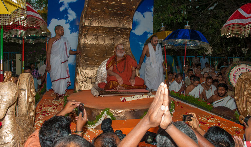 Speaking on the occasion, Swami Dayananda Saraswati referred to the popular adjective used for Sri Adi Shankaracharya – श्रुतिस्मृतिपुराणानाम् आलयम् – The Shruti, Smriti and Puranas constitute our scriptures, our Vedic heritage – they constitute all that is knowing worthwhile. There is nothing outside these three. And the word “आलयं” means “अासमन्तात् लीयन्ते अस्मिन्” – All the three found their abode, their shrine in Adi Shankara. And the same words we can say for our Acharya, Jagadguru Sri Sri Bharati Tirtha Mahaswamiji. Whoever sits in the Sringeri Peetham will command respect. That is the greatness of the Peetham. At the same time, whoever sits on the Peetham has to bring respect to the Peetham. And that is what our Acharya has done.
