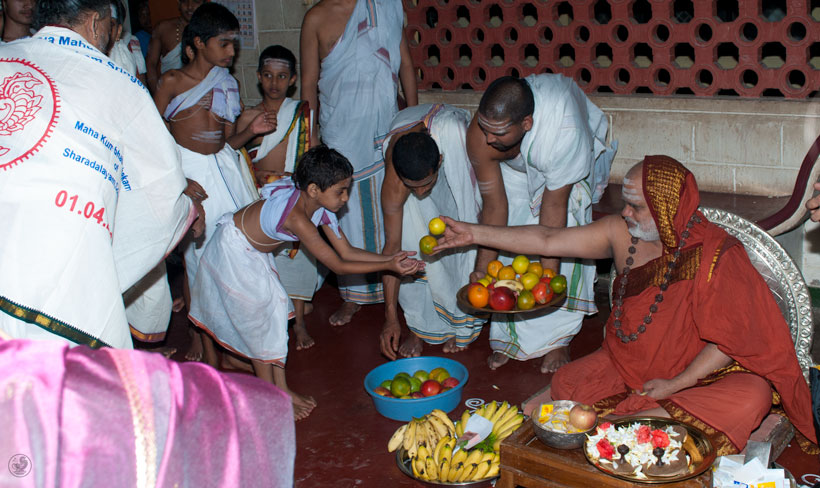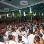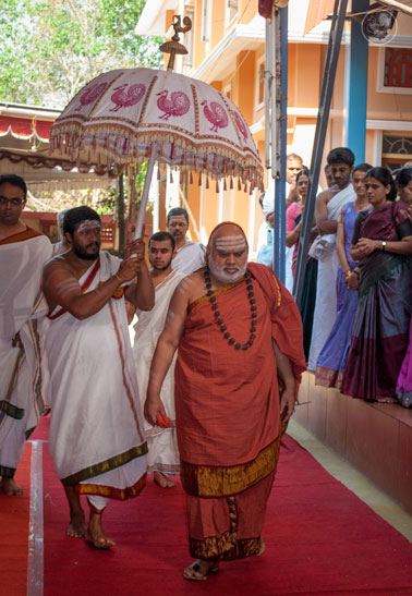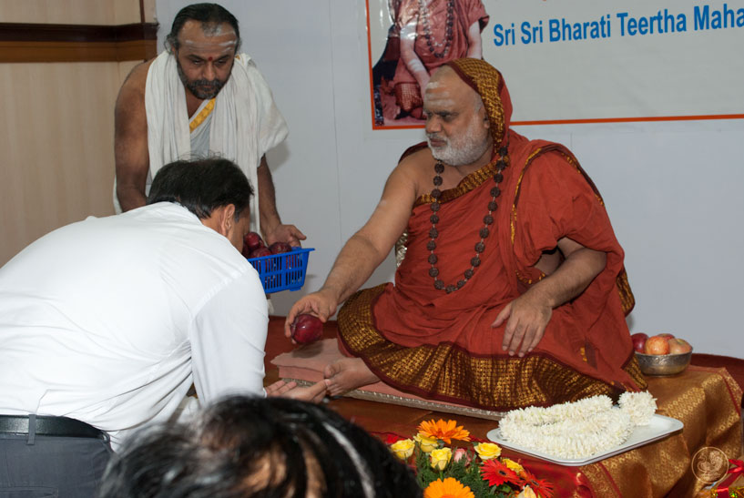 On March 28th, the Vardhanti day, thousands of devotees assembled in a serpentine queue to have the Ahnika Darshan of the Jagadguru. The special Darshan started at 7 a.m. and continued till 10:15 am. The Jagadguru then performed a special Puja to Goddess Sharada. Ayushya Homa Poornahuti and Maharudra Poornahuti took place in the Jagadguru’s presence.