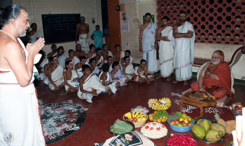 While returning the Jagadguru graced the Veda Pathashala at Annapoorneshwari Yoganarasimha temple, RS Puram, Coimbatore and blessed the students and teachers. The Jagadguru started from Coimbatore on the afternoon of 4th April towards Kerala.