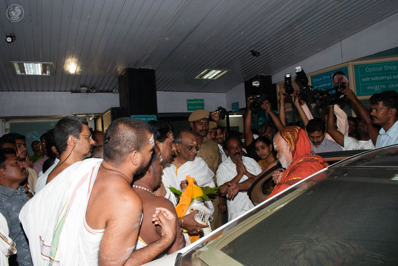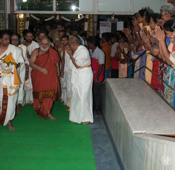 On 26th March evening, the Jagadguru graced the Pathashala being run by ardent disciple, Vedabrahmasri Jambunatha Ghanapatigal at Coimbatore and blessed the students and teachers. The Jagadguru also graced the KG Hospitals in Coimbatore and blessed the efforts of the doctors led by Dr. Bhaktavatsalam, Chairman of the KG Hospitals.