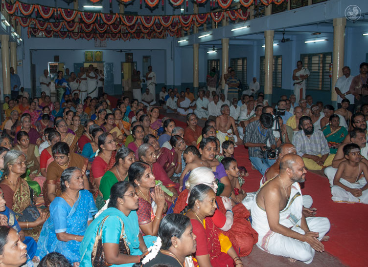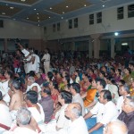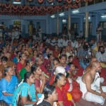 The Jagadguru reached Coimbatore on the evening of 20th March and was received with great devotion by a huge number of devotees. Dhuli Pada Puja to the Jagadguru was performed by Dharmadhikari Sri C G Venkataramanan at Sharadalayam, Sringeri Shankara Math, Race Course Road, Coimbatore. In His Anugraha Bhashanam, the Jagadguru said that Dharma has to be adhered whether one is learned, wealthy, powerful. The greatness of Dharma can be felt when one realizes that the Lord Himself descends to protect when it is on the decline. Even in a company, the Chairman intervenes to address an issue only if it is not addressable by everyone else under him. The issue has to be important enough for the Chairman to intervene. So too is the case with Dharma. When Dharma is under threat, the Lord Himself intervenes and protects it. Such is the greatness of Dharma.