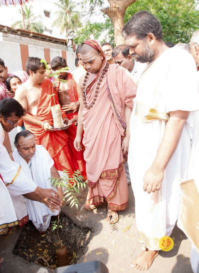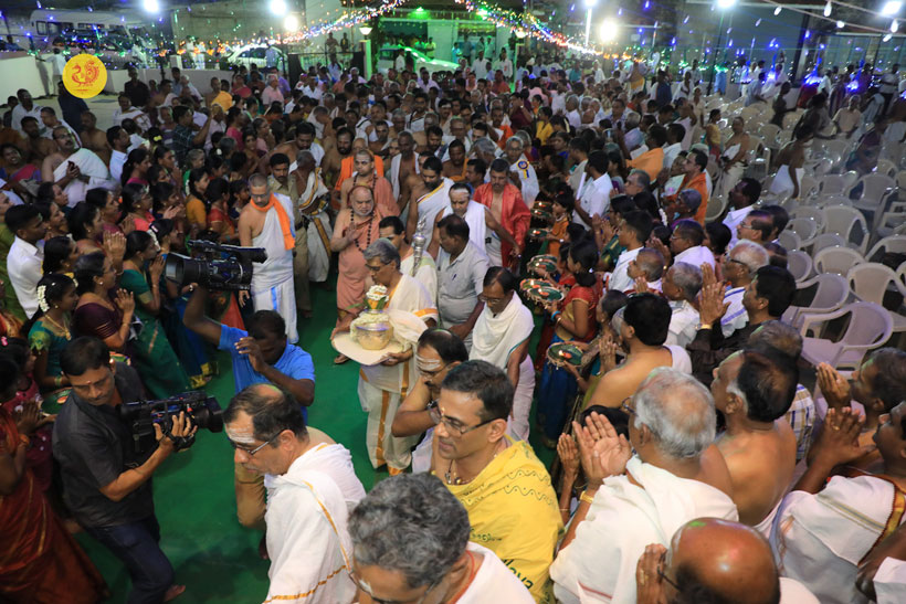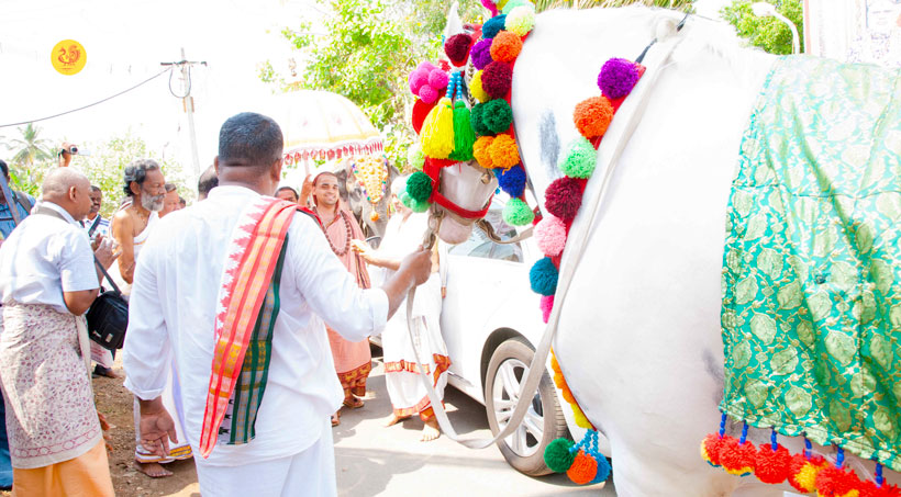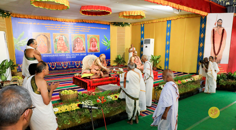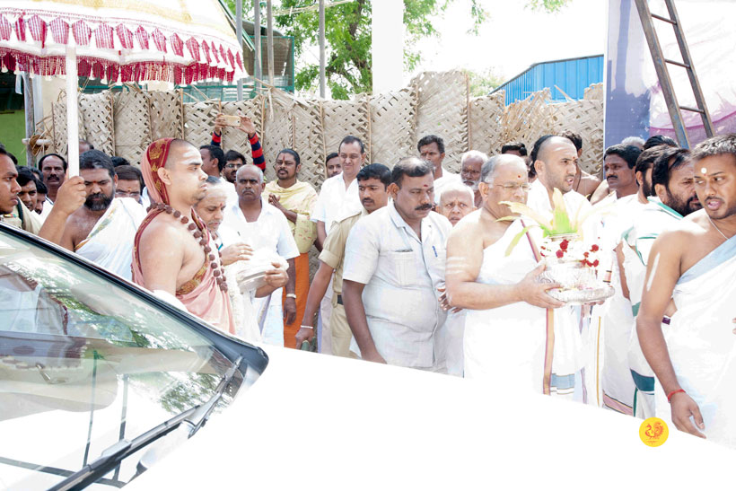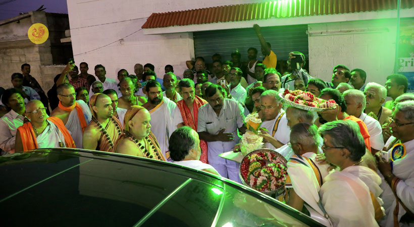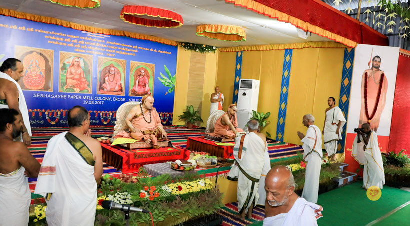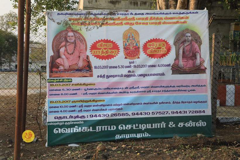 Jagadguru Shankaracharya Sri Sri Bharati Tirtha Mahasannidhanam and Jagadguru Sri Sri Vidhushekhara Bharati Sannidhanam arrived at Erode to a rapturous welcome in the evening of March of 18, 2017. Dhuli Pada was performed by Dharmadhikari Sri Ramanathan.