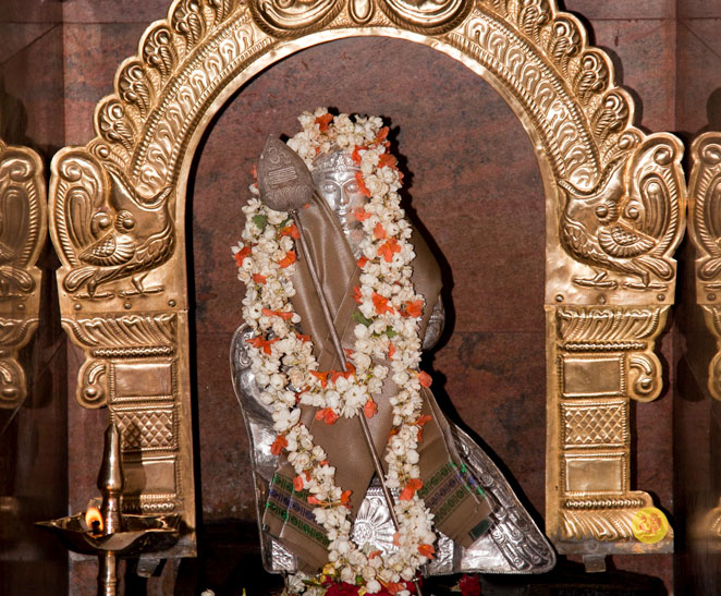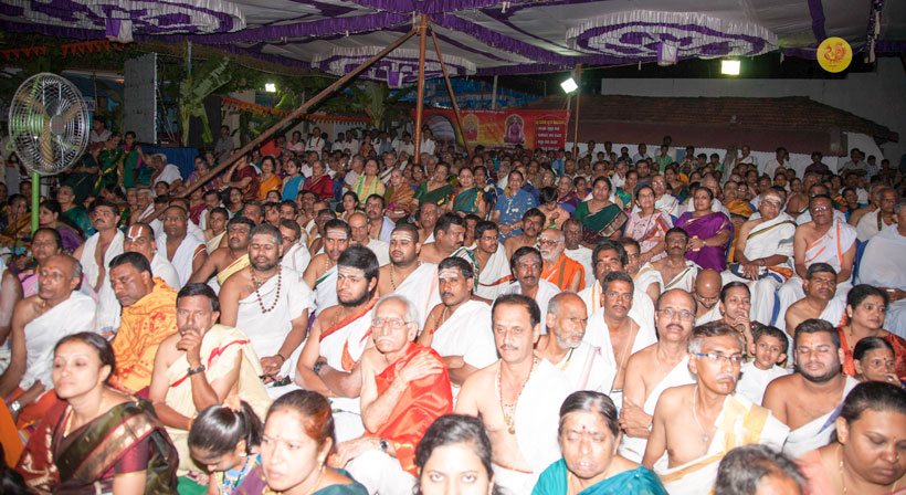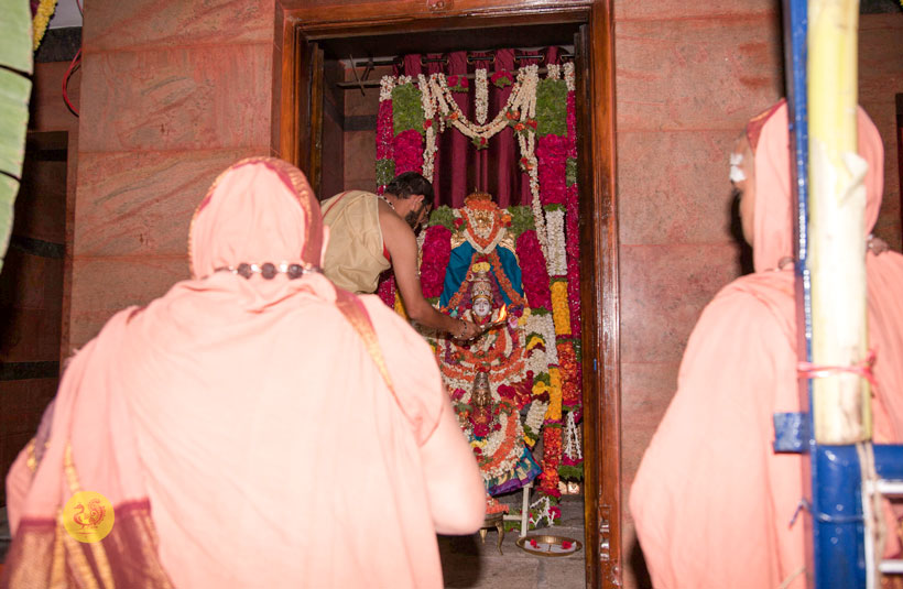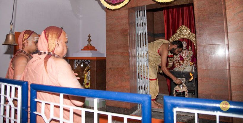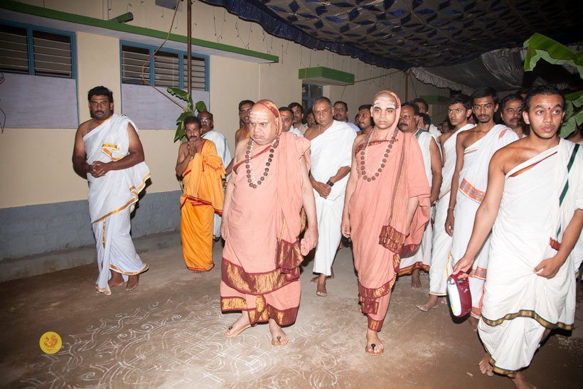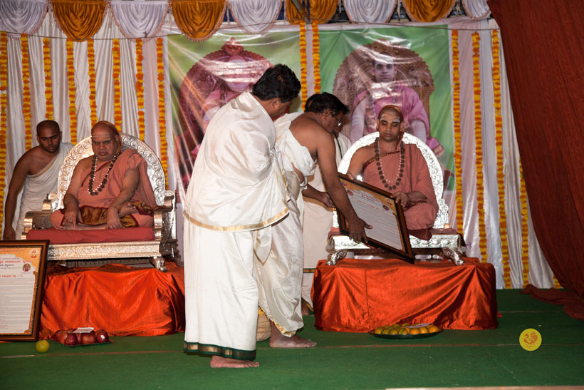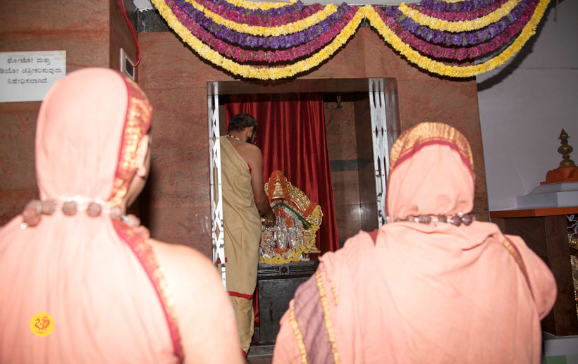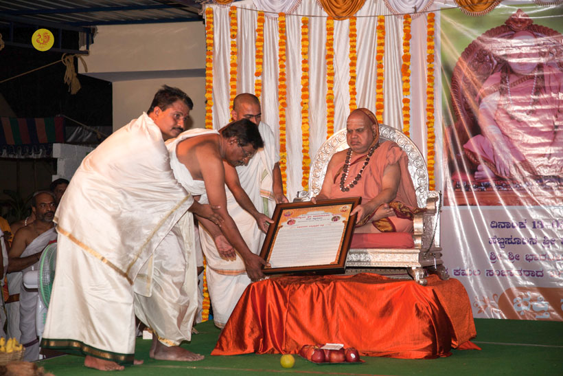 Dhuli Pada Puja was performed by Dharmadhikari Sri HS Sridhara Prasad. After Veda Ghosha and Prayer, a citation in Kannada (binnavattale) was read out and offered to the Ubhaya Jagadgurus.
