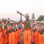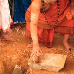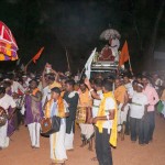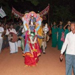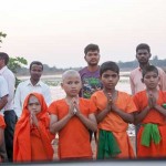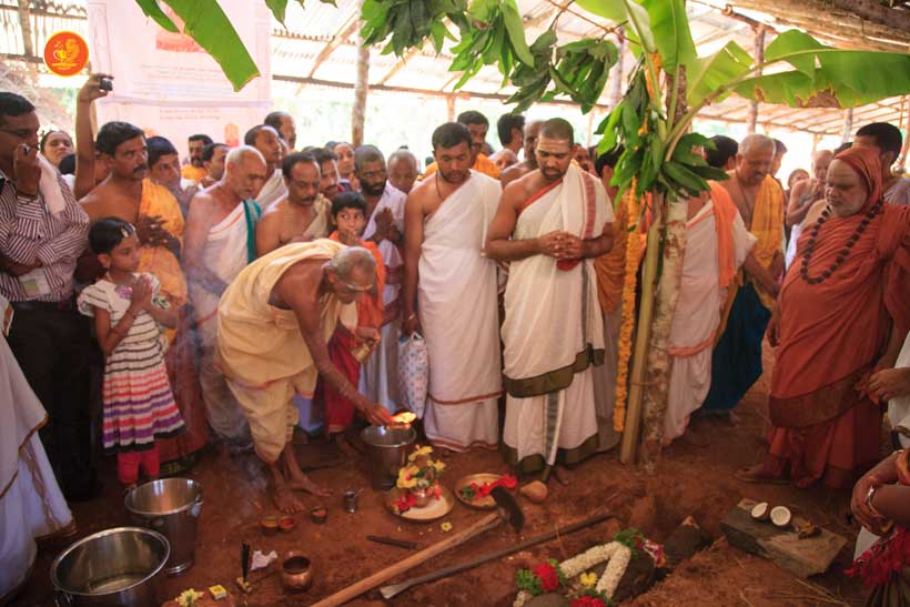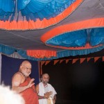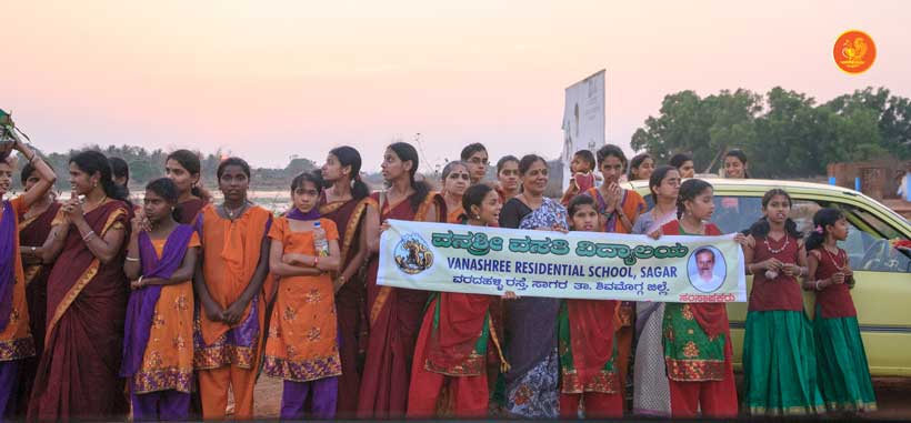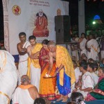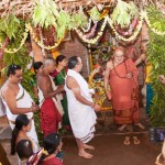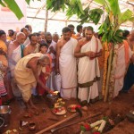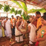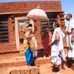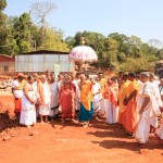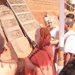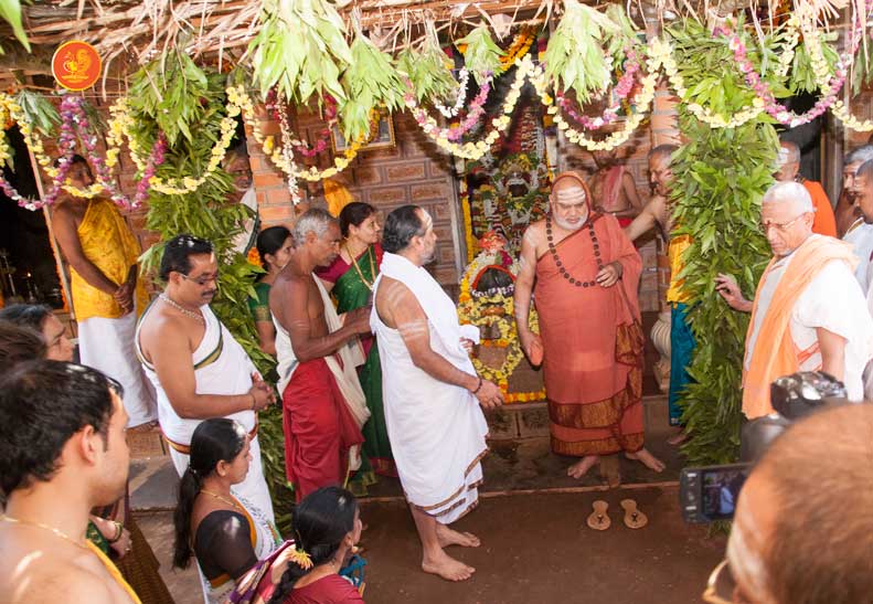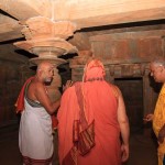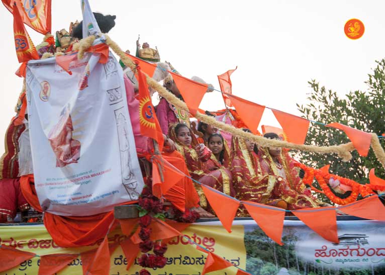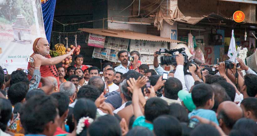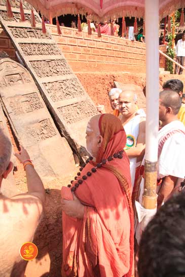 Jagadguru Shankaracharya Sri Sri Bharati Tirtha Mahaswamiji arrived at Anandapuram near Hosagunda at around 6:30 pm on the evening of 4th April 2013. Devotees led by Sri CM Narayana Shastry welcomed the Jagadguru. CEO & Administrator, Sri V R Gowrishankar was also present. The Jagadguru then travelled to Hosagunda and was led in a procession to the heritage area. After Dhuli Pada Puja and Swagata Patrika Vachanam, the Jagadguru in His brief Anugraha Bhashanam praised the efforts to restore the glory of the heritage of this town that is nearly a millenium old.