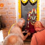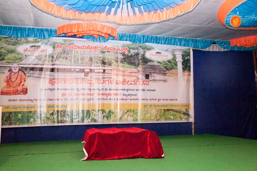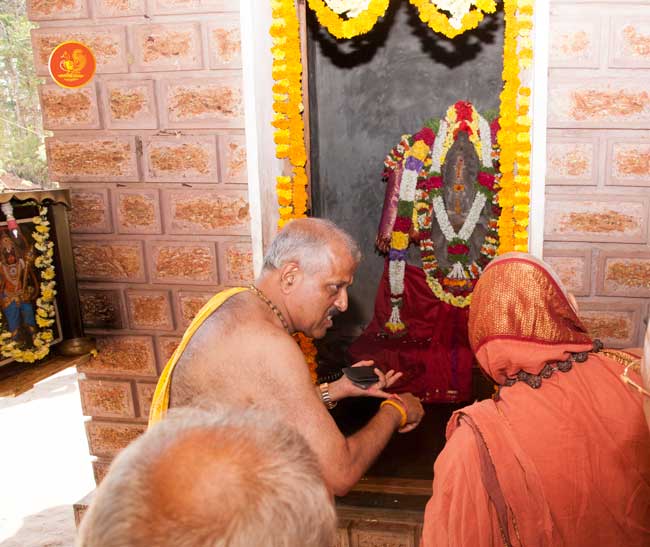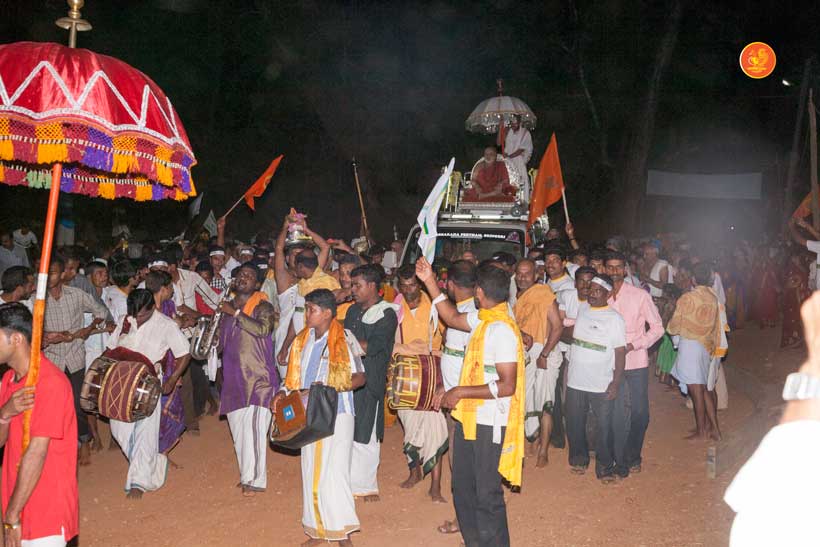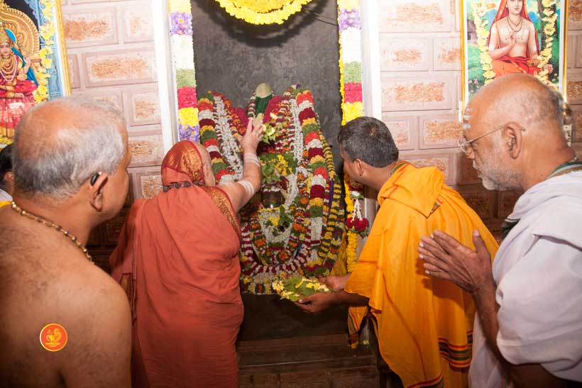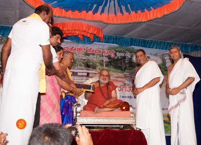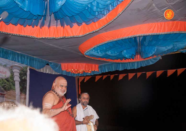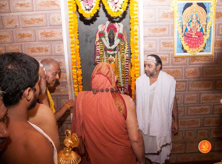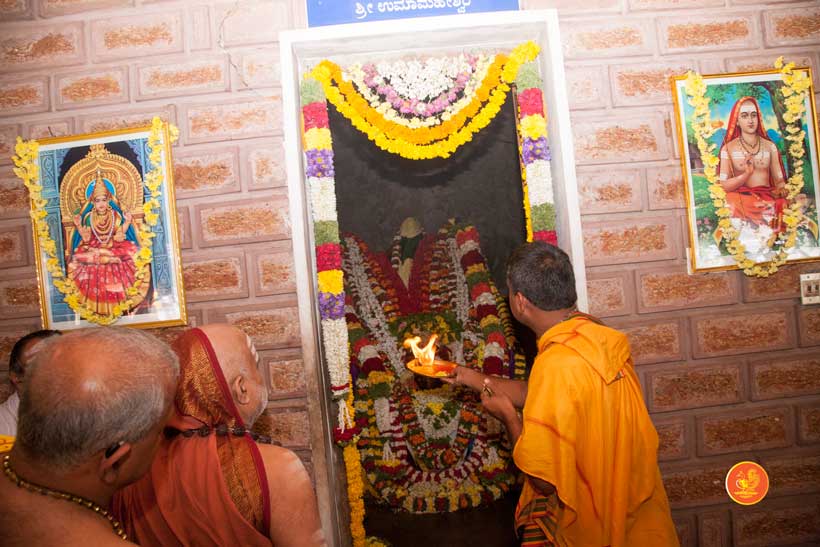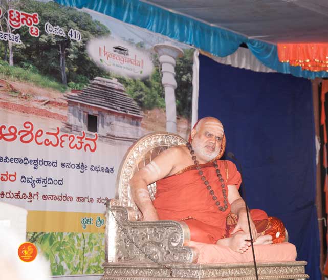 The following morning, the Jagadguru had Darshan of Sri Uma Maheshwara in the Balaalayam. The Jagadguru also had Darshan of Sri Veerabhadra and Sri Mahishasuramardini. The Jagadguru then witnessed the restoration and construction activity for the temples of Sri Uma Maheshwara, Sri Prasanna Narayana, Goddess Kali and Sri Lakshmi Ganapati. The Jagadguru in His morning Anugraha Bhashanam spoke about the Grace of Bhagavan in our lives for us to attain success in our endeavours and to achieve Shreyas. The Jagadguru provided a number of reasonings to drive home this fact. Going about our lives with unflinching devotion will ensure that our lives are purposeful. The Jagadguru then specially blessed Sri CM Narayana Shastry and invoked the blessings of Goddess Sharada and Lord Chandramoulishwara for the restoration work at Hosagunda.