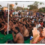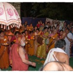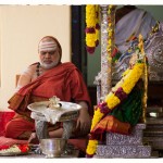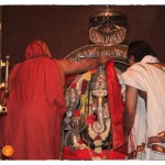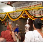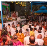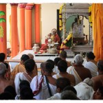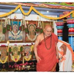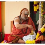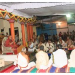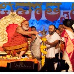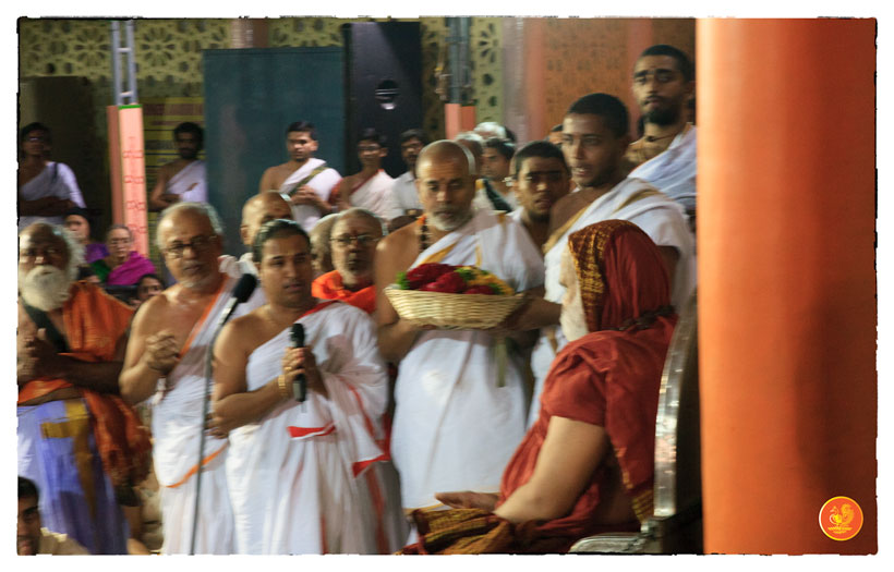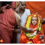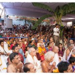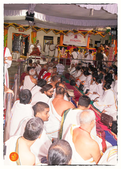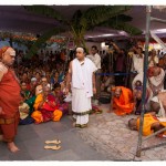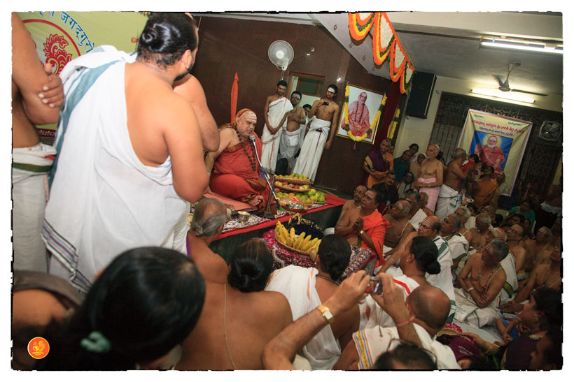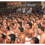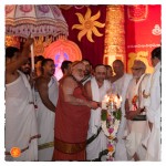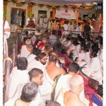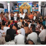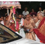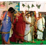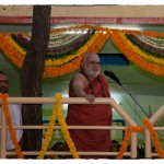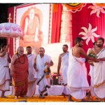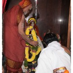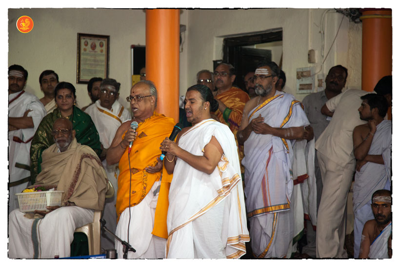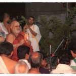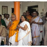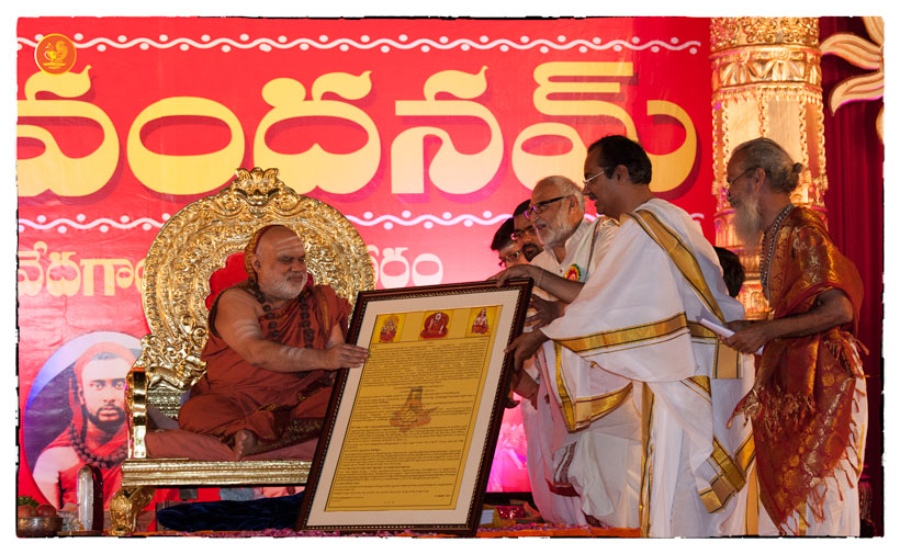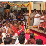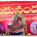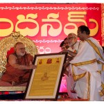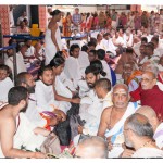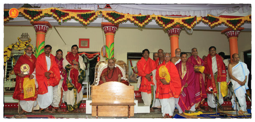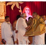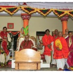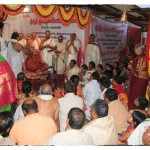 On the morning of 3rd December, the Jagadguru inaugurated a Veda Sammelan. Sri Yegnasubramanian, Chairman, Sringeri Vidya Bharati Foundation, USA gave the inaugural address explaining the need to continue the Vedic tradition. About 150 Vedic scholars; Ghanapatis and Kramapatis from the twin cities of Hyderabad and Secunderabad participated. The Valedictory function held in the evening started with the scholars chanting a Varna Krama at the behest of the Jagadguru. At the end of the Veda Sabha, the Jagadguru gave an Anugraha Bhashanam and blessed the Vedic Pandits. The Pandits were then honoured. The function ended with Sri Yegnasubramanian being honoured in the Jagadguru’s presence for his efforts in spreading the Vedas.