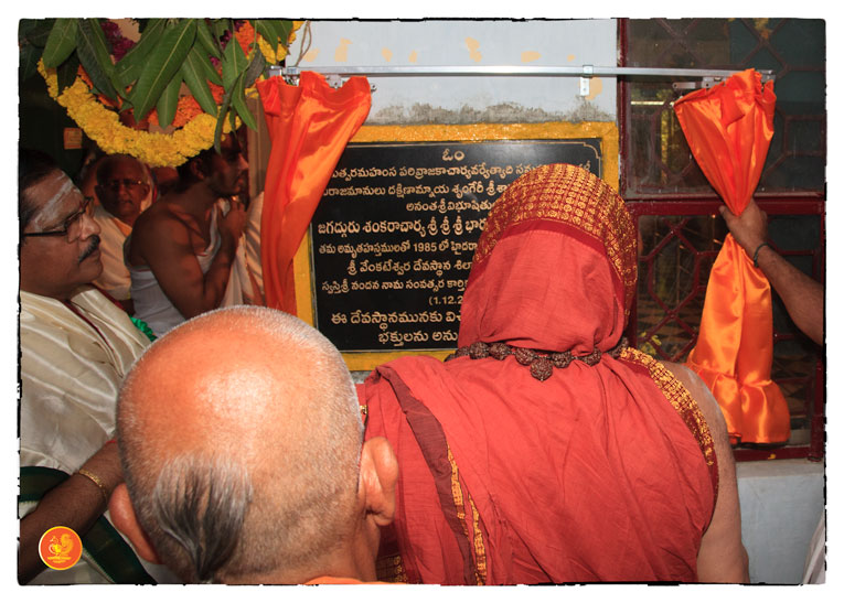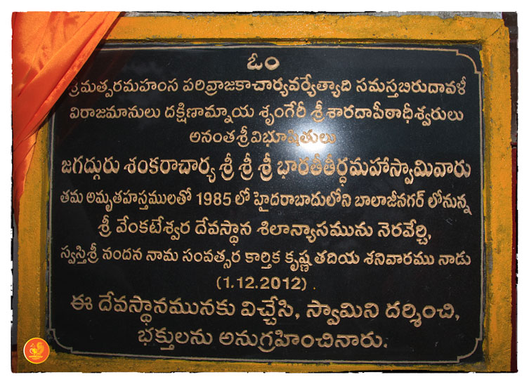 On 1st December 2012, the Jagadguru visited two temples affiliated to Sri Sringeri Peetham: Sri Venkateswara Swamy Temple, Balaji Nagar and Sri Ramalayam Temple, Vidyanagar. The Jagadguru also graced Sri Subramanya Samajam at Nallakunta.