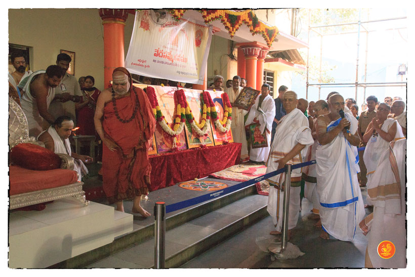 On 14th December, a Guru Vandana Sabha Public Function organized by Darshanam Telugu spiritual magazine took place at Lalita kala thoranam, Public Gardens. Many distinguished speakers, poets expressed their feelings of Guru Bhakti. The distinguished participants included Dr. Dorbala Prabhakara Sharma (who welcomed the Jagadguru in Sanskrit), renowned Pauranika Malladi Chandrashekhara Shastri, Mahamahopadhyaya Pullela Ramachandrudu, Darshanalankara Vishwanatha Gopala Krishna Shastri, Gandluri Dattatreya Sharma, Akella Vibhishana Sharma of TTD, Jonnavithula Ramalingeshwara Rao, Sri N.V.R.Sarma of Darshanam Magazine, among many others. Sri PVRK Prasad, former IAS and former Media Advisor and Additional Secretary to Prime Minister, also spoke on the greatness of the Jagadguru remembering that in the mid 1990s, it was the Jagadguru who had been accepted by all religious leaders of Sanatana Dharma as the leading representative to unite the thoughts of all followers of Sanatana Dharma. The Jagadguru released a special Guru Vandanam edition of Darshanam magazine and also a book titled “Wheels Behind the Veil” authored by Sri Prasad.