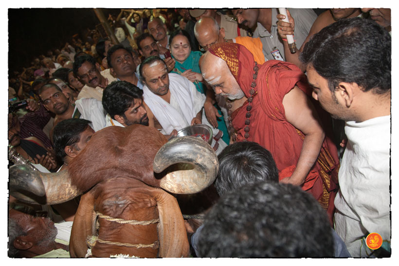 The Jagadguru illustrated that Go-Mata is given a high pedestal amongst animals because the Vedas themselves state – मा गामनागामदितिं वधिष्ट – Let the cow that is naturally calm and peaceful never be harmed. The Jagadguru also said that it can be established by reason that the utility value associated with a cow, given all the diary products as well as uses of the urine and dung of the cow are so unique that such a utility value cannot be associated with any other animal. Thus do the Shastras remain authoritative in matters of Dharma.
