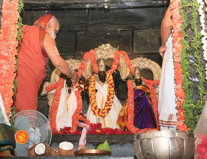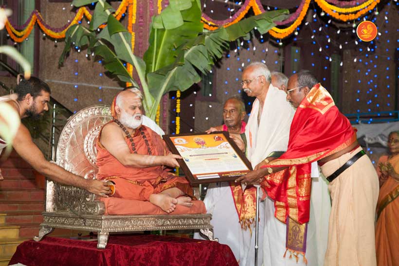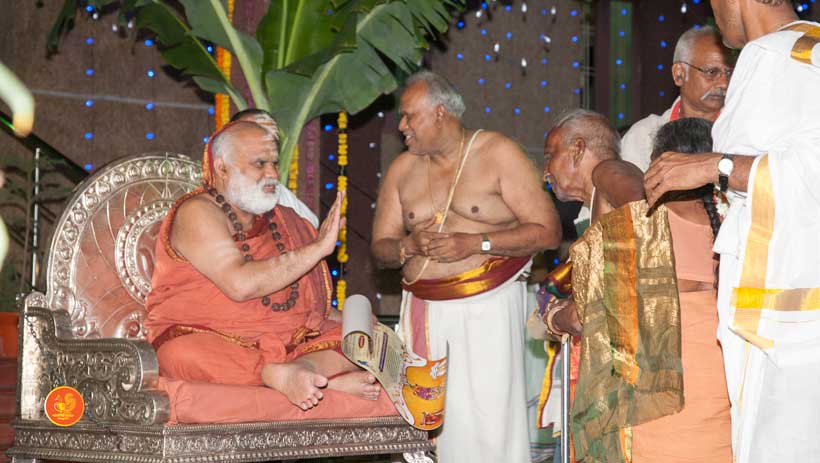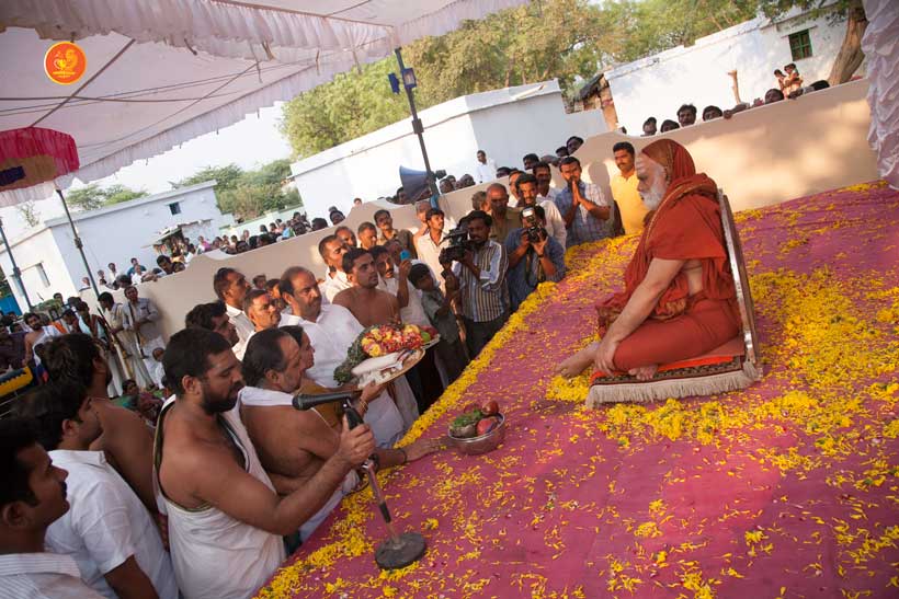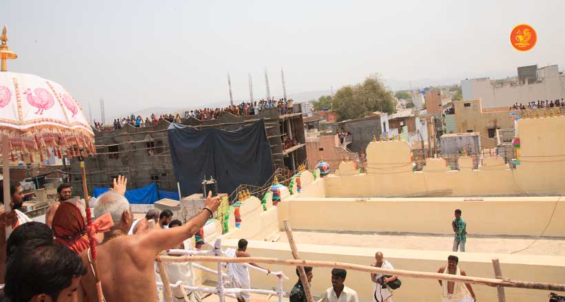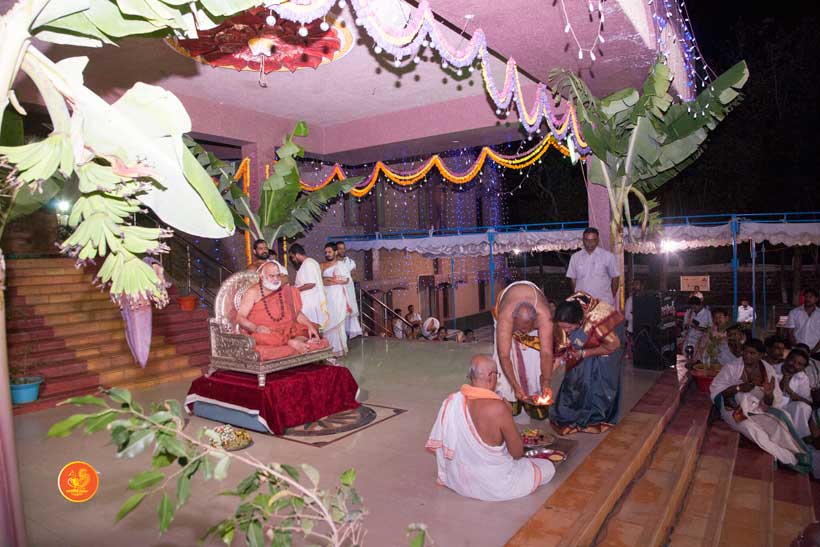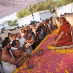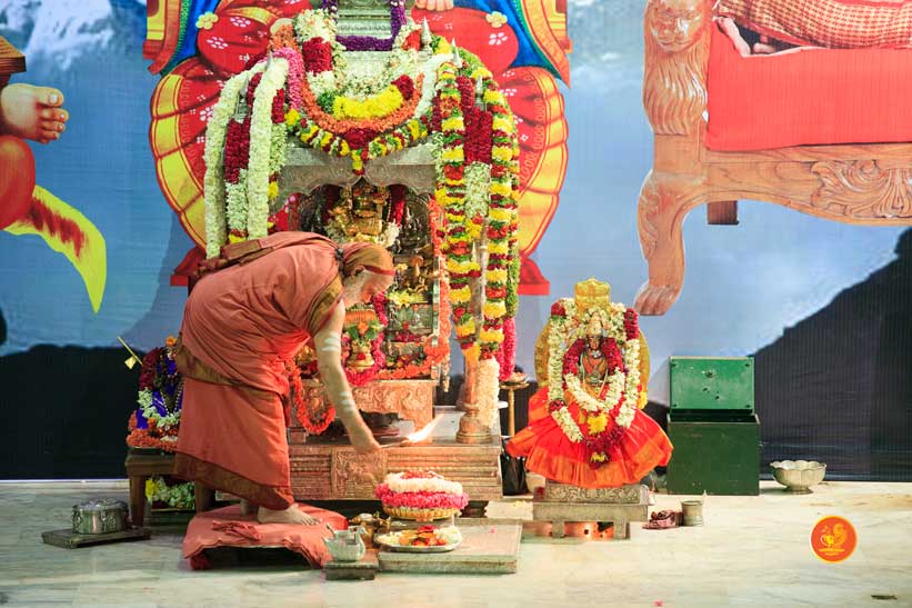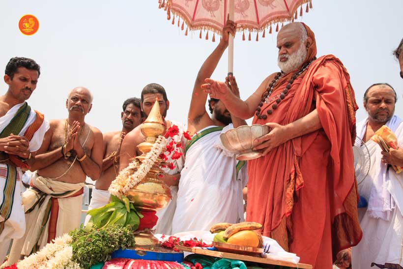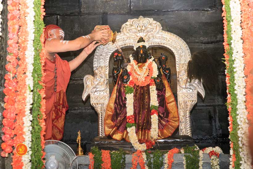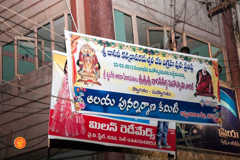 On 22nd March, the Jagadguru performed the Punah Prathishta Kumbhabhisheka of Vasavi Kanyaka Parameshwari at Kadapa. The Jagadguru also consecrated shrines of Sri Chandramoulishwara and Sri Ramachandra Swamy adjacent to the main shrine of Sri Vasavi Kanyaka Parameshwari. After performing the Shikhara Kalashabhisheka to the Vimanas of the three shrines, the Jagadguru in His Anugraha Bhashanam said that it was fitting that a shrine for Lord Shiva and one for Lord Vishnu (Ramachandra Swamy) had been established in the temple, as if to indicate the essence of Sanatana Dharma — the two forms are but one and the same. The Jagadguru expressed great joy at the devotion of the tens of thousands of devotees who attended the occasion, and blessed that the deep Guru-Shishya relationship between the Sringeri Jagadgurus and the community in Kadapa continue to thrive.