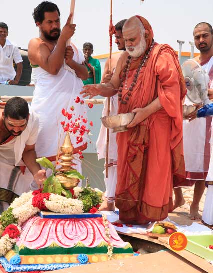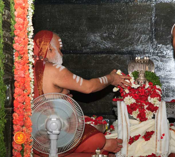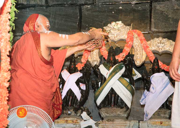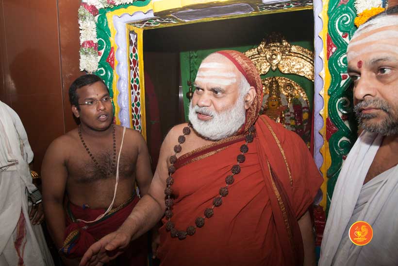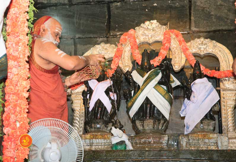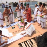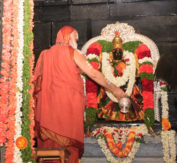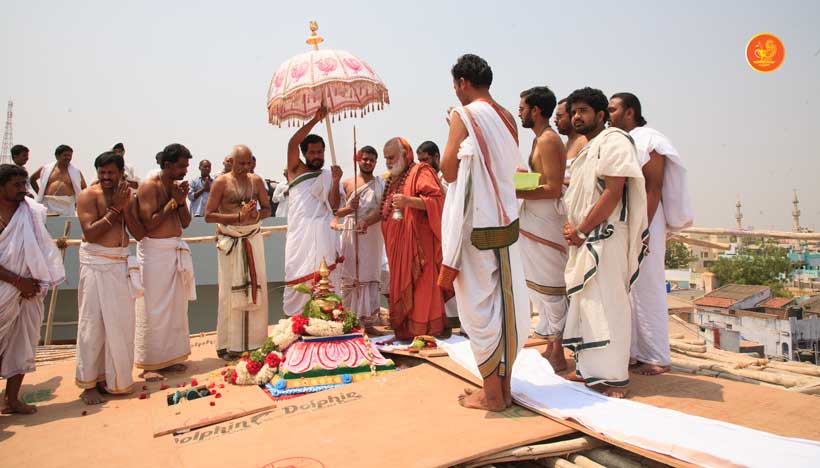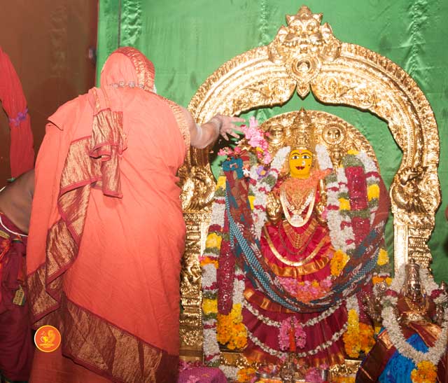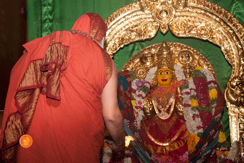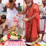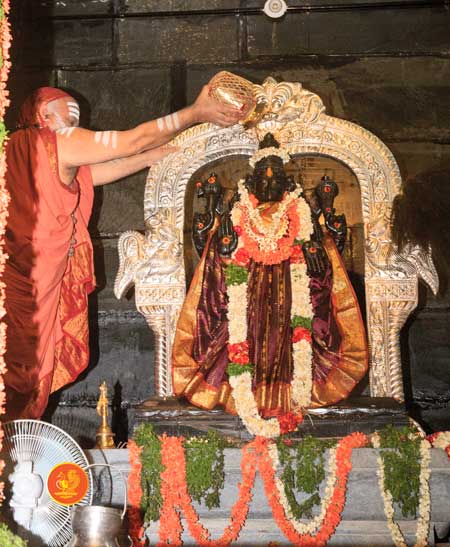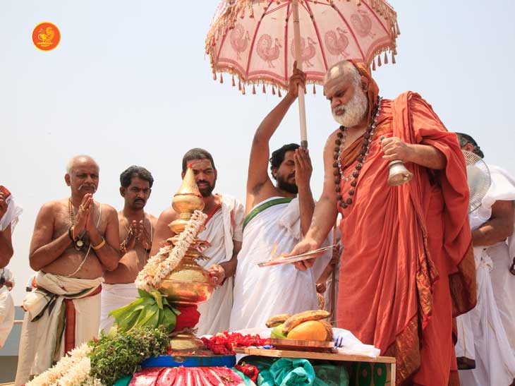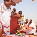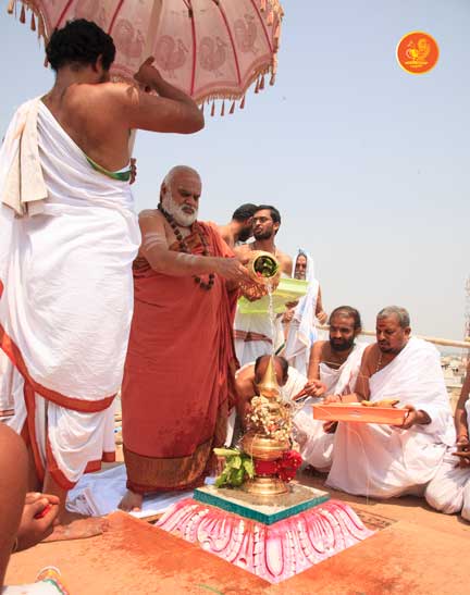 On 22nd March, the Jagadguru performed the Punah Prathishta Kumbhabhisheka of Vasavi Kanyaka Parameshwari at Kadapa. The Jagadguru also consecrated shrines of Sri Chandramoulishwara and Sri Ramachandra Swamy adjacent to the main shrine of Sri Vasavi Kanyaka Parameshwari. After performing the Shikhara Kalashabhisheka to the Vimanas of the three shrines, the Jagadguru in His Anugraha Bhashanam said that it was fitting that a shrine for Lord Shiva and one for Lord Vishnu (Ramachandra Swamy) had been established in the temple, as if to indicate the essence of Sanatana Dharma — the two forms are but one and the same. The Jagadguru expressed great joy at the devotion of the tens of thousands of devotees who attended the occasion, and blessed that the deep Guru-Shishya relationship between the Sringeri Jagadgurus and the community in Kadapa continue to thrive.