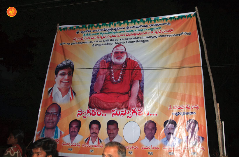 Jagadguru Shankaracharya Sri Sri Bharati Tirtha Mahaswamiji started from Vemulawada in the early afternoon of December 28th and arrived at the holy town of Kaleshwaram. The Jagadguru first had Darshan of Sri Kaleshwara and Sri Mukteeshwara and then graced the Welcome Sabha. The officials of the temple recounted how many decades ago, the temple had been in a dilapidated state and had now become a beautiful structure owing to the blessings of Sri Sri Mahasannidhanam (Jagadguru Sri Sri Abhinava Vidyatirtha Mahaswamiji).