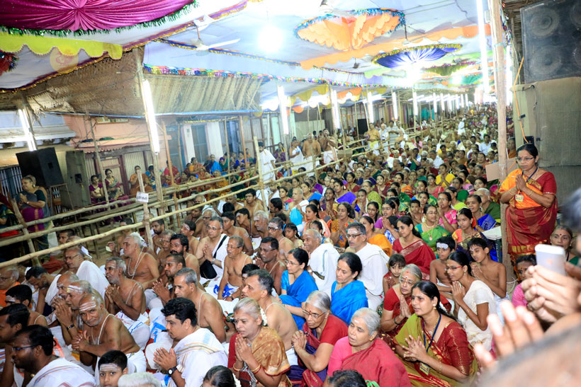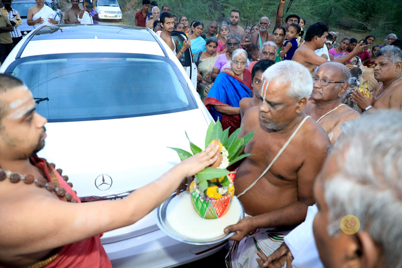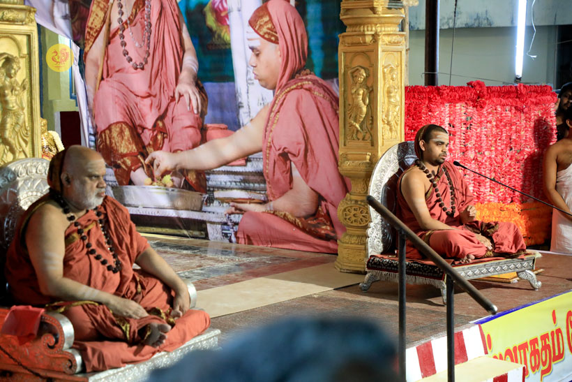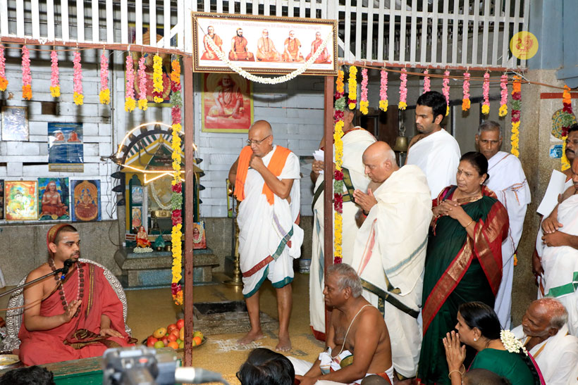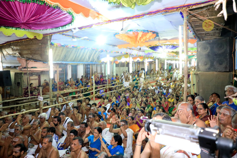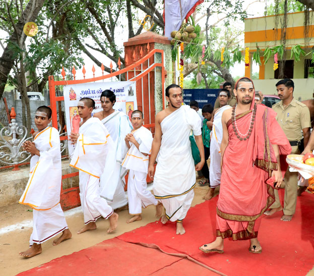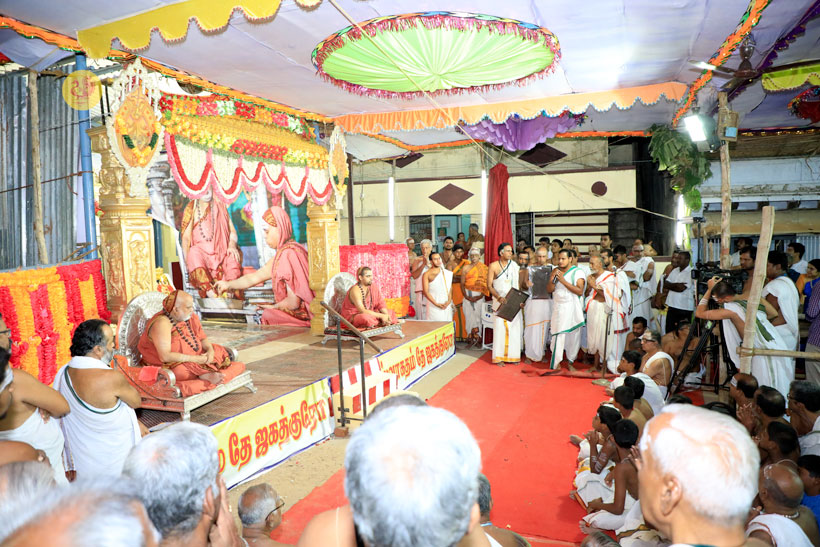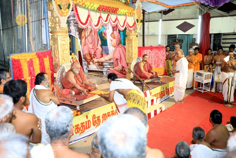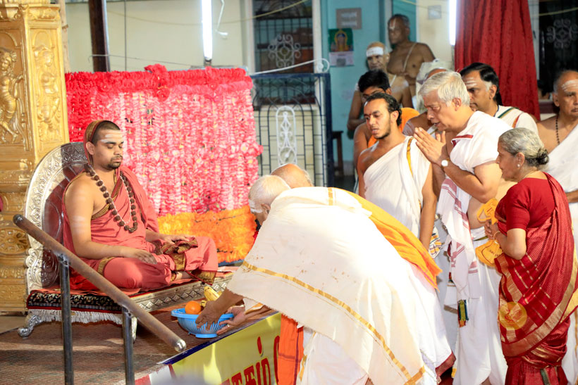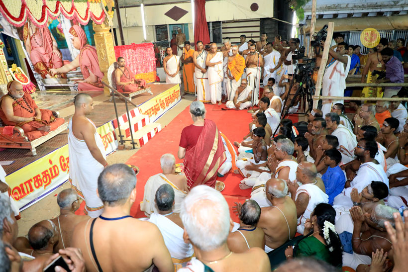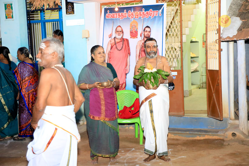 At the public function organised to welcome the Jagadgurus, Dhuli Pada Puja was performed by Sri Shankar Subramaniam. After Veda Ghosha and Samarpanam of Sanskrit and Tamil Swagata Patrikas, the Jagadgurus graced the gathering with Anugraha Bhashanams.