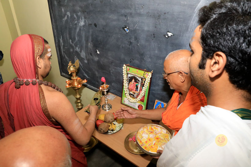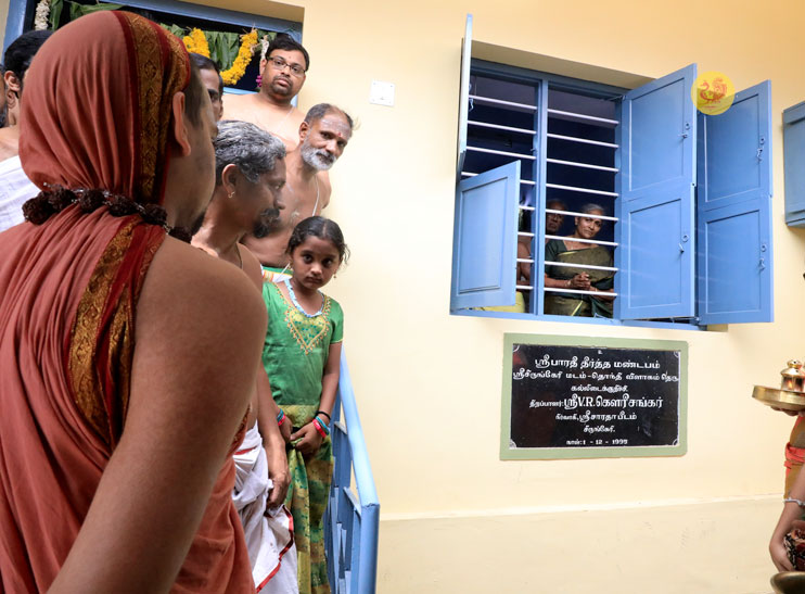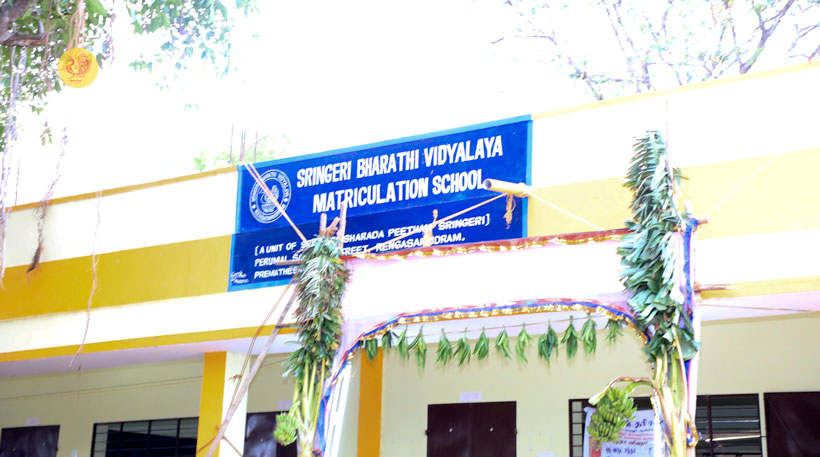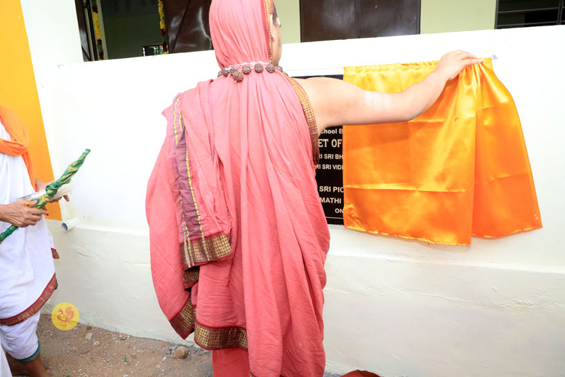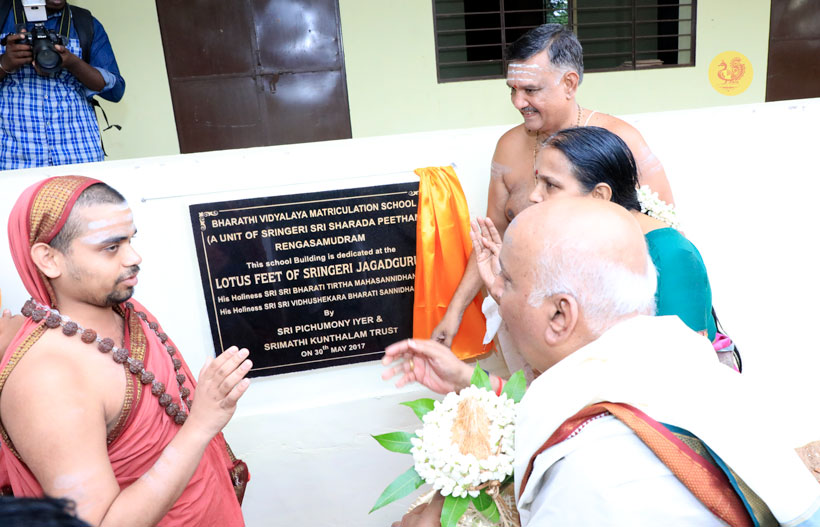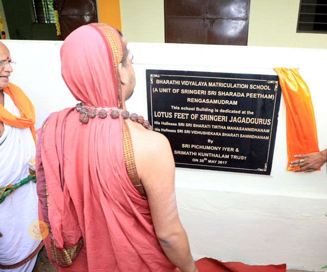At Rangasamudram, Sri Sannidhanam graced the newly constructed premises  of Sringeri Bharathi Vidyalaya school and then arrived at the Sri Bharati Tirtha Veda Pathashala. In His Anugraha Bhashanam, Sri Sannidhanam pointed out that Bhartruhari has stated that a Brahmana loses his sanctity by not studying the Vedas — विप्रो नश्यति अनध्ययनात्. Praising the efforts of Sri Sundaram, Sri Sannidhanam blessed the teacher and students of the Pathashala.