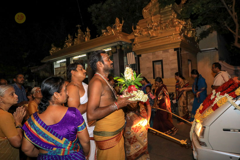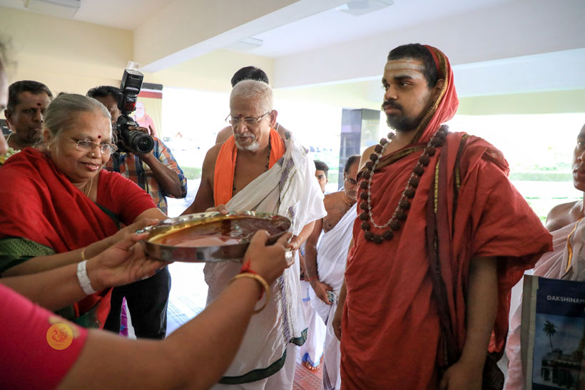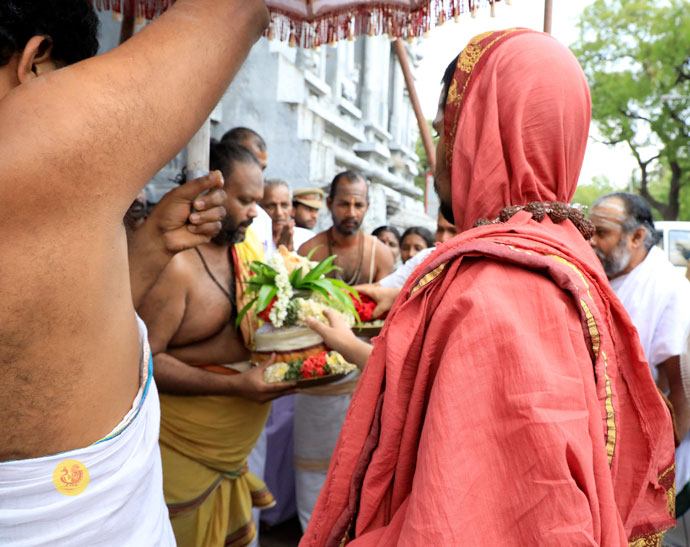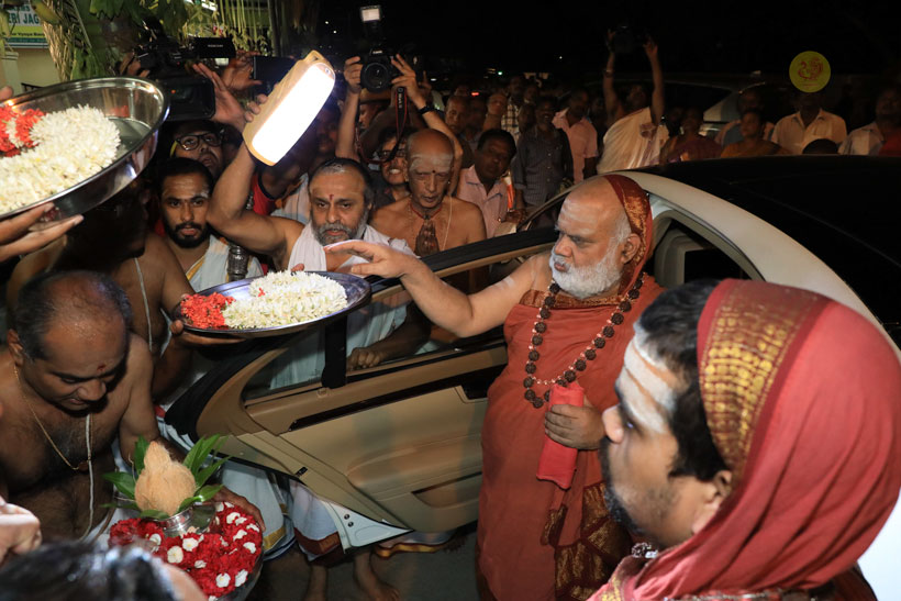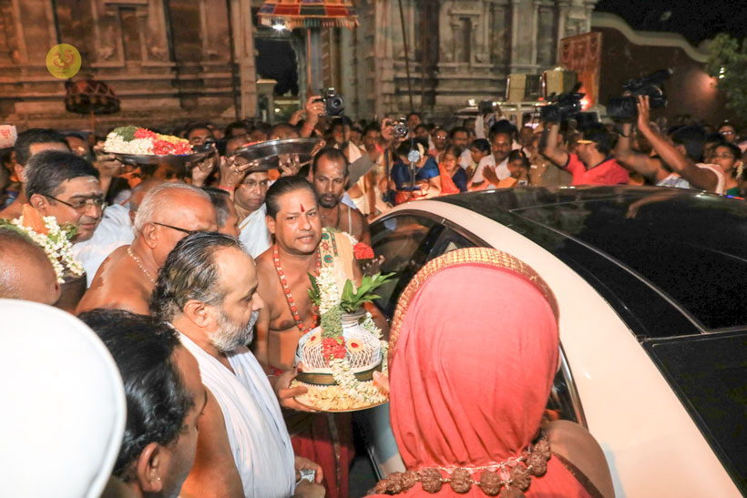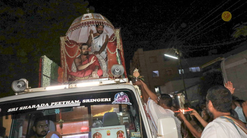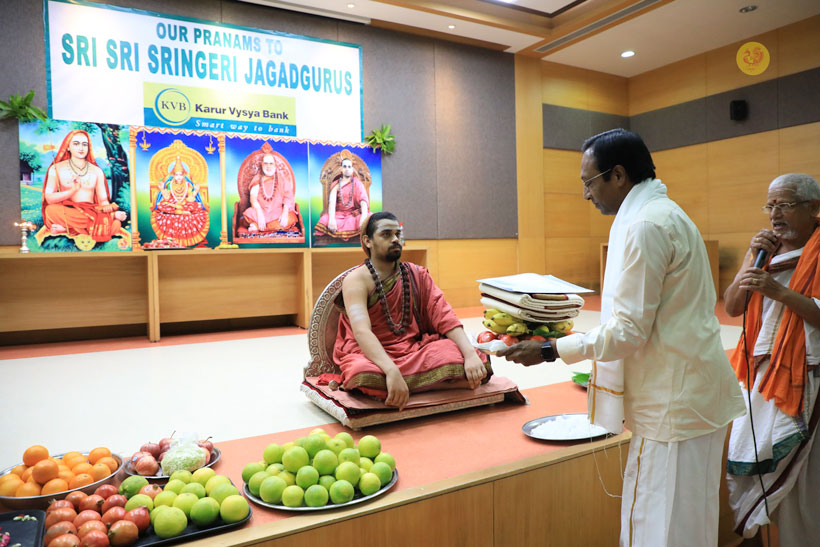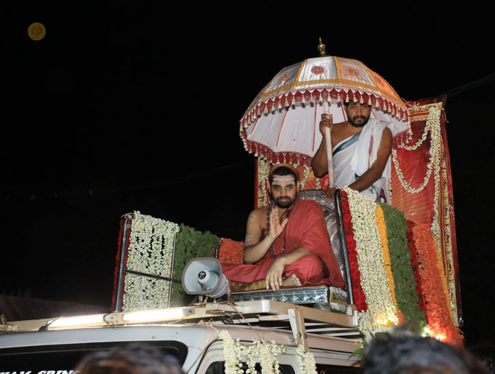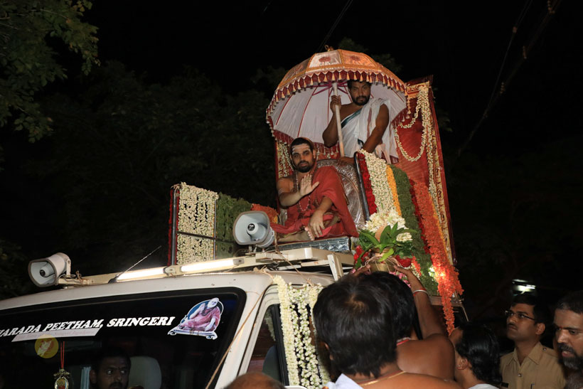 In the evening of May 4, 2017, Sri Mahasannidhanam and Sri Sannidhanam arrived to a rousing reception by devotees at Karur in front of the Rajagopuram of Sri Pashupateeshwarar temple. Sri Sannidhanam was led in a procession. At the public function organised on the occasion, Dhuli Pada Pooja was performed by the Manager of the Karur branch of Sringeri Math, Sri Shankaranarayanan.