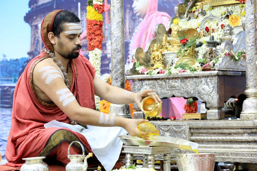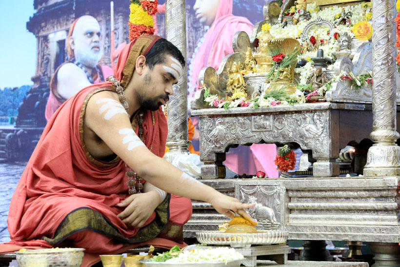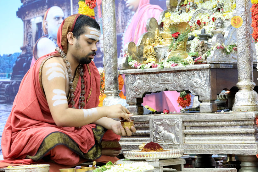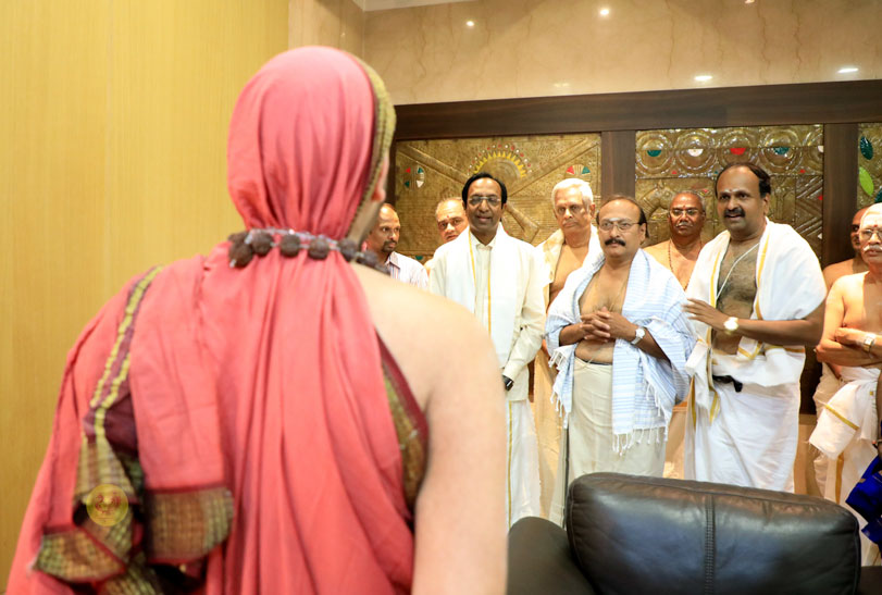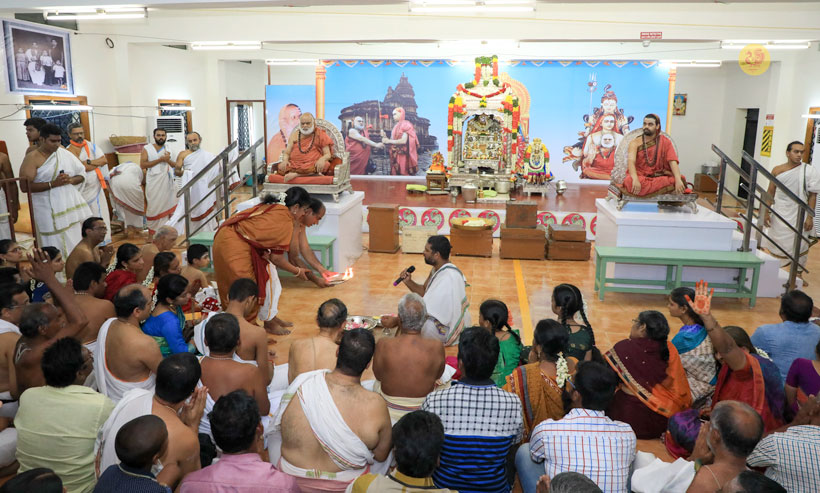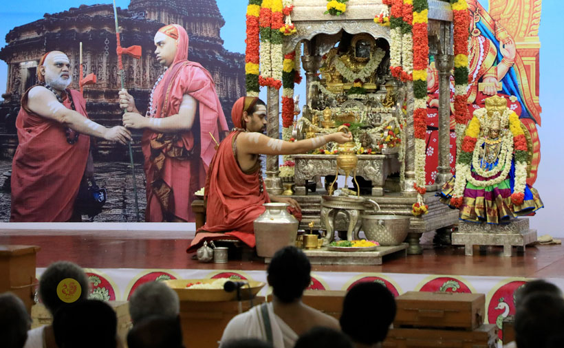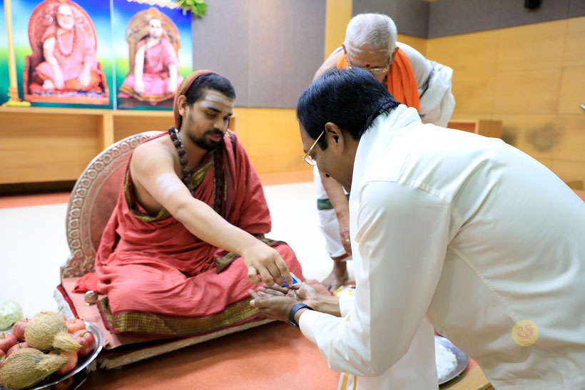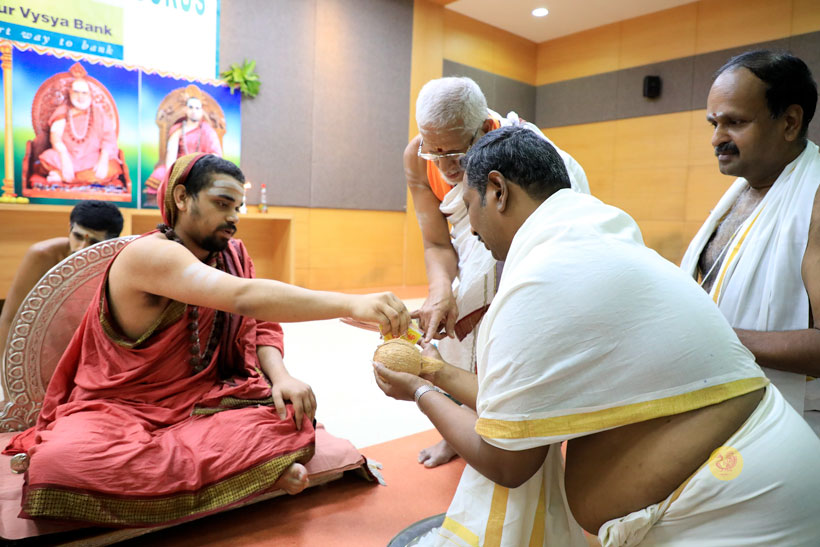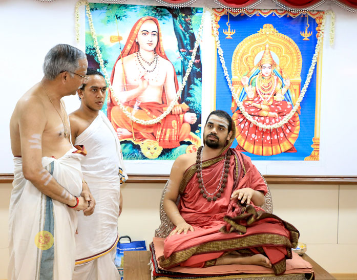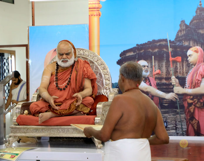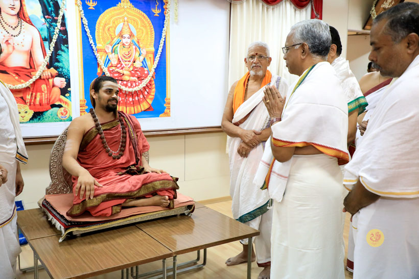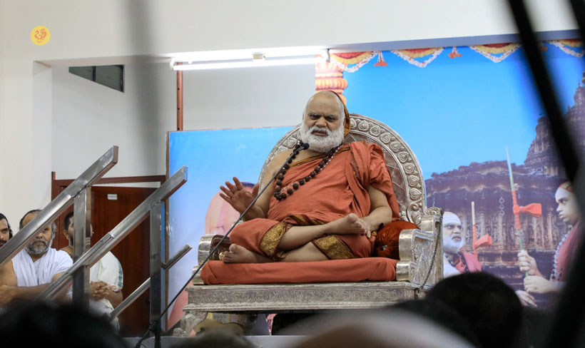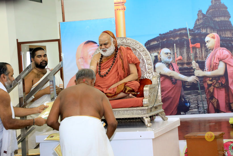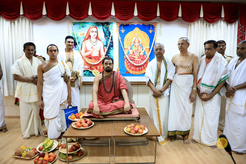 The public function organised thence began with Veda Ghosha and prayer song “Jaya deva Jaya deva Jaya Satgurunatha”. Swagata Patrikas in Sanskrit and Tamil were read and submitted to the Jagadgurus.
