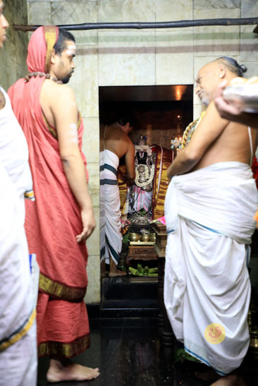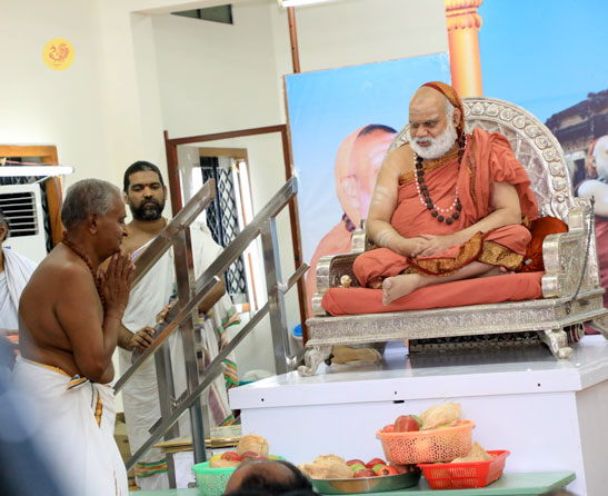 In the evening, Sri Sannidhanam graced the headquarters of the Karur Vysya Bank and the Lakshmi Vilas Bank at Karur and blessed the owners and employees. Sri Sannidhanam then graced the town of Mohanur in Namakkal district. Sri Sannidhanam first had Darshan in the Perumal temple and blessed devotees with an Anugraha Bhashanam. Sri Sannidhanam then returned to Karur and performed the Sharada Chandramoulishwara Pooja.