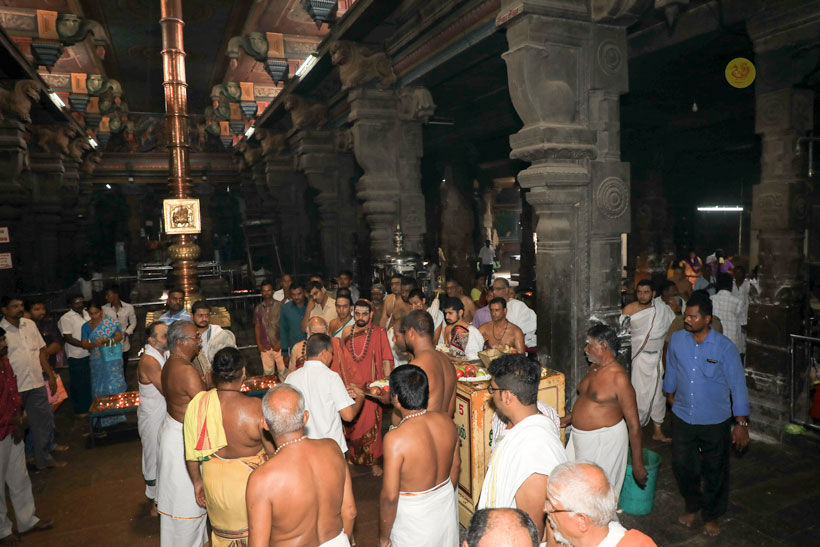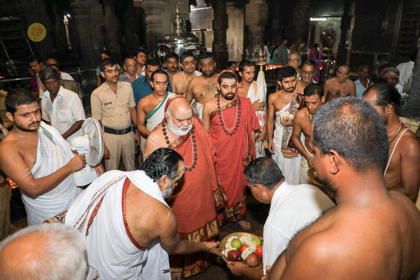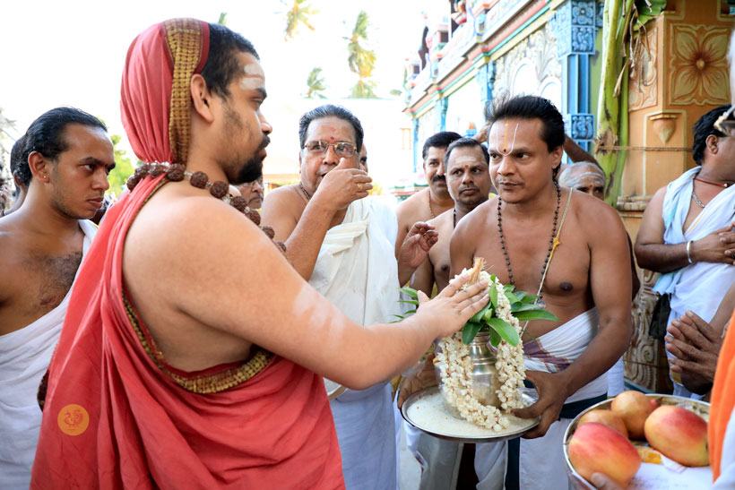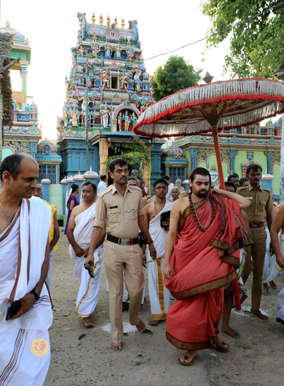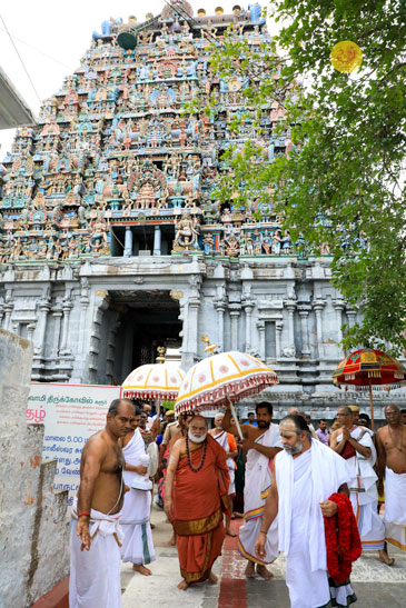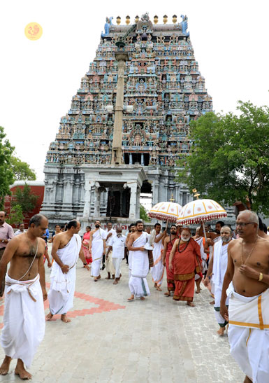 In the morning of May 6, Sri Mahasannidhanam and Sri Sannidhanam visited the Pashupateeshwarar temple and had Darshan. After granting Darshan to devotees later in the morning, the Jagadgurus started for Nerur in the afternoon.