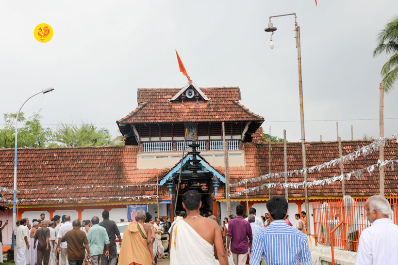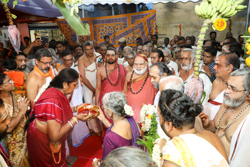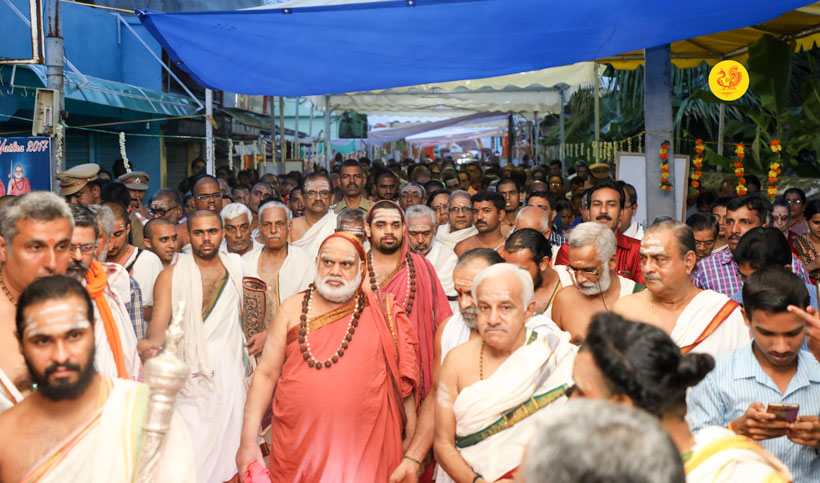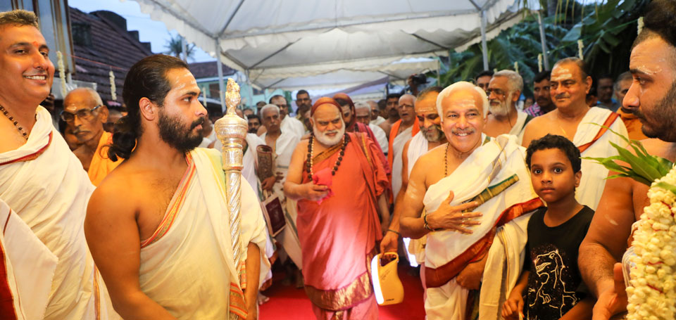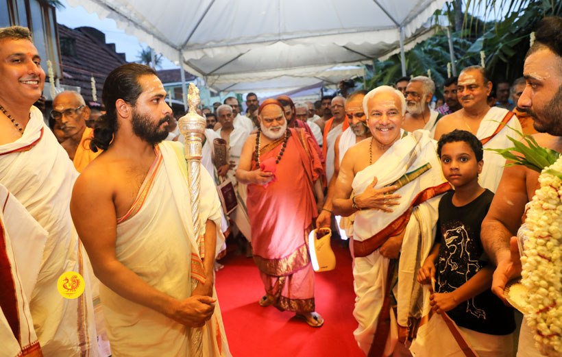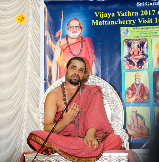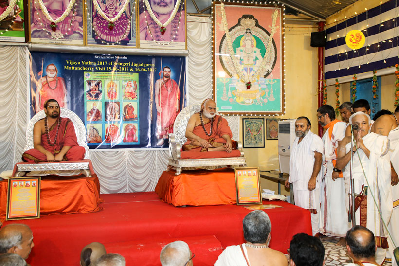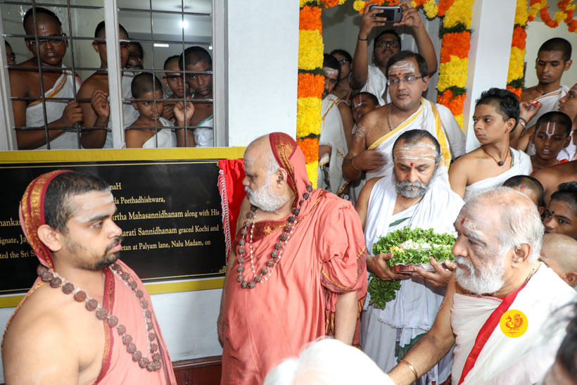 Sri Mahasannidhanam and Sri Sannidhanam arrived at Mattancherry in Kochi to a rapturous reception. On arrival at Mattancherry in Kochi, Jagadguru Shankaracharya Sri Sri Bharati Tirtha Mahaswamiji had Darshan at the Dharma Shasta temple. Dhuli Pada Puja was performed by Sri V S Parasurama Iyer of the Karanthayar Palayam Maha Samooham. After Veda Ghosha and Prarthana, a Swagata Patrika in Malayalam was read and submitted to the Jagadgurus. Sri Ramalingam, Vice President, All India Brahmins’ Federation speaking on the occasion attributed the grace of the Jagadgurus to the successful functioning of the “Sri Bharati Tirtha Veda Pathashala” at Mattancherry. A book containing the Ashtottara of Sri Adi Shankara Bhagavatpada in Malayalam script was released on the occasion as part of the Adi Shankaracharya Ashtottara Shatanama Parayana Yajnam.