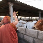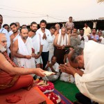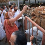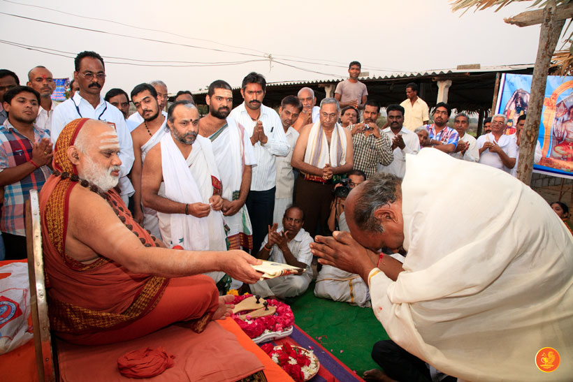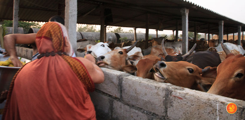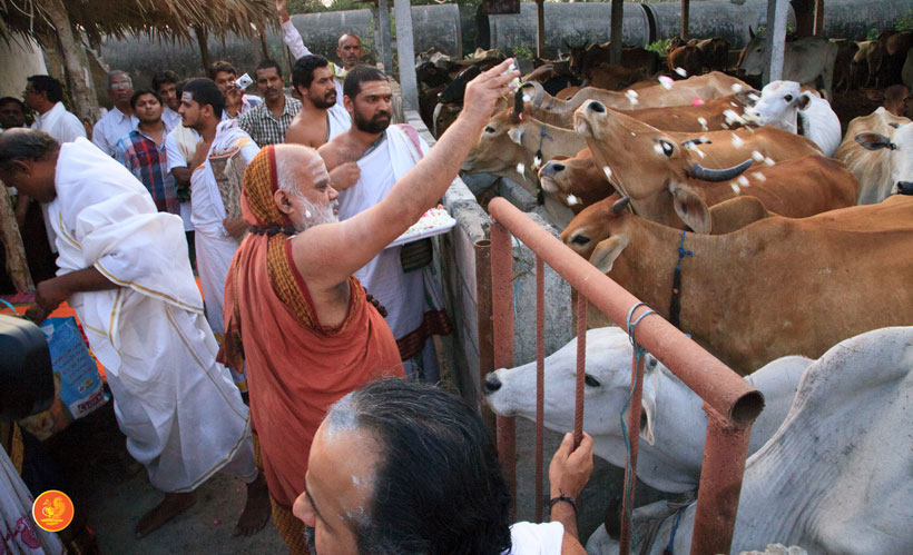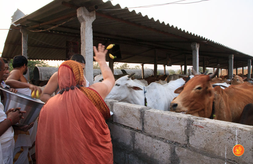 In the afternoon, the Jagadguru started from Kothagudem and graced the Annapoorna Goshala, Palvancha. The Jagadguru spent some time feeding the hundreds of cows in the Goshala and commended and blessed the owner of the Goshala for providing shelter for abandoned cows and those injured by road accidents.