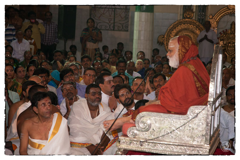 The Madhaviya Shankara Digvijaya describes how Sri Adi Shankaracharya Himself overcame Kama when still a young boy – कामं वस्तुविचारतोऽच्छिनदयम्. – by Vastu Vichara – by analyzing the object of the desire and by realizing the essential utility of the object in question. The Jagadguru explained that one must reflect over whether the object of desire is indeed going to benefit or whether it is going to ultimately harm you or lead to your downfall. When such reflection is not done, people tend to go the wrong way, go after satisfying limitless desires and ultimately perish.
