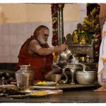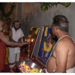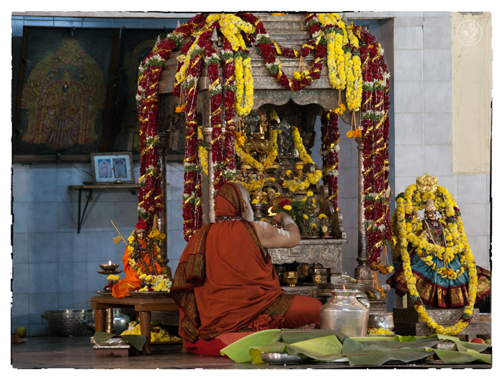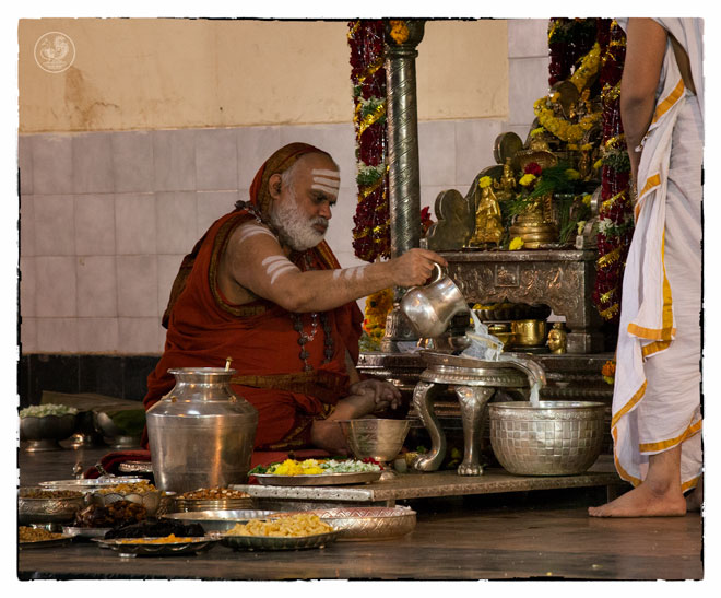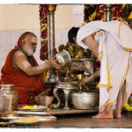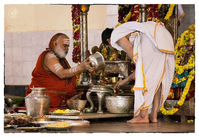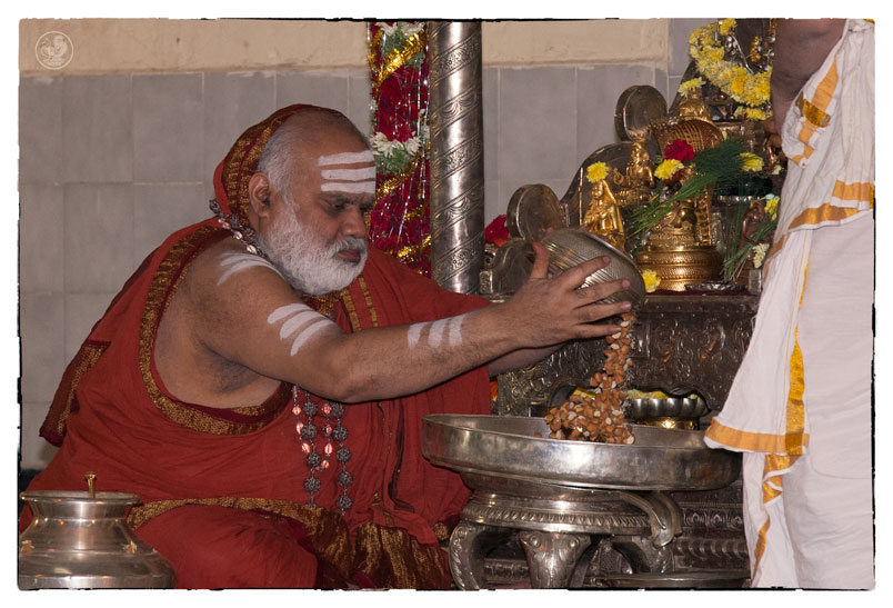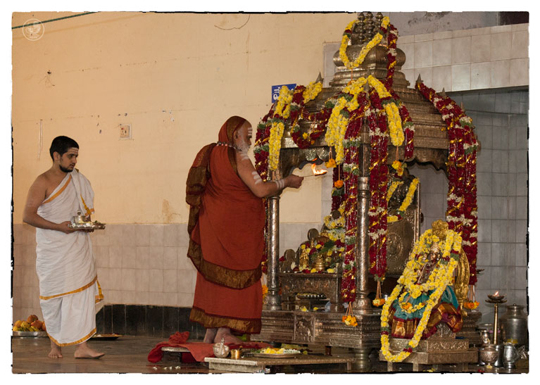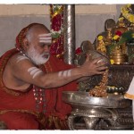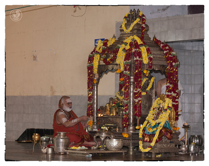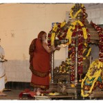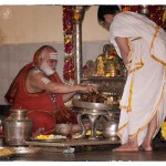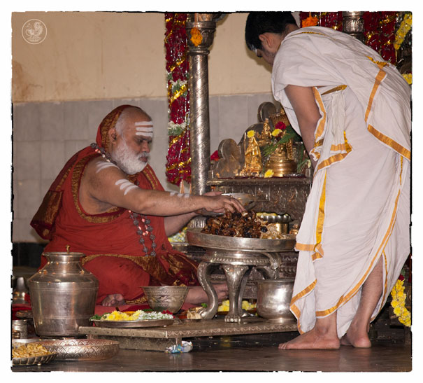 On the morning of November 19th, the Jagadguru gave Darshan to devotees from around 10 am. Devotees offered Pada Puja and Bhiksha Vandanam. Subsequently, the Jagadguru performed the Karthika Somavara Puja, worshipping the sacred Chandramoulishwara Sphatika Linga by offering of Panchamrita Abhisheka, Abhisheka to the chants of Sri Rudram and sections of Sri Mahanarayana Upanishad. Devotees felt blessed by the divine sight of the Jagadguru offering such elaborate worship.