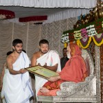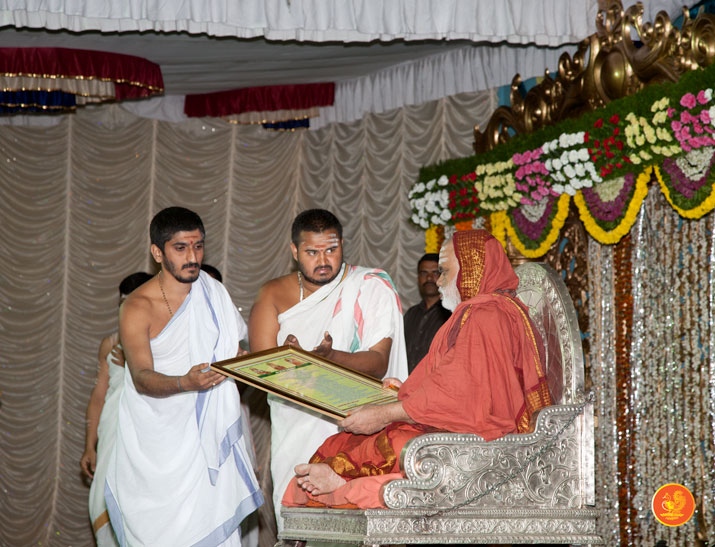 The Jagadguru ended his Anugraha Bhashanam, blessing the brothers, Sri Radhakrishna and Sri Gopikrishna (alumni of the Sringeri Pathashala) who had established the Sri Bharati Tirtha Vedic Foundation at Lingannapeta, their fathers Rama and Lakshmana and the people of Lingannapeta. The Jagadguru also blessed the Vidyarthis and Adhyapakas of the foundation’s Pathashala.