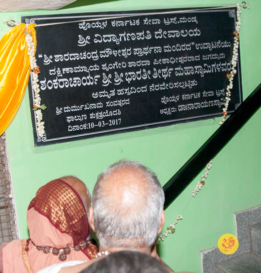 Jagadguru Shankaracharya Sri Sri Bharati Tirtha Mahasannidhanam arrived at Mandya from Hassan at around 10:30am to a reverential welcome by devotees led by Dr. Narayanaswamy. Sri Mahasannidhanam had Darshan at the Vidyaganapati temple and then inaugurated the Sri Sharada Chandramoulishwara Prarthana Mandiram.