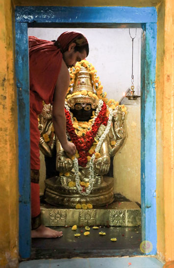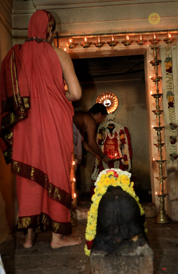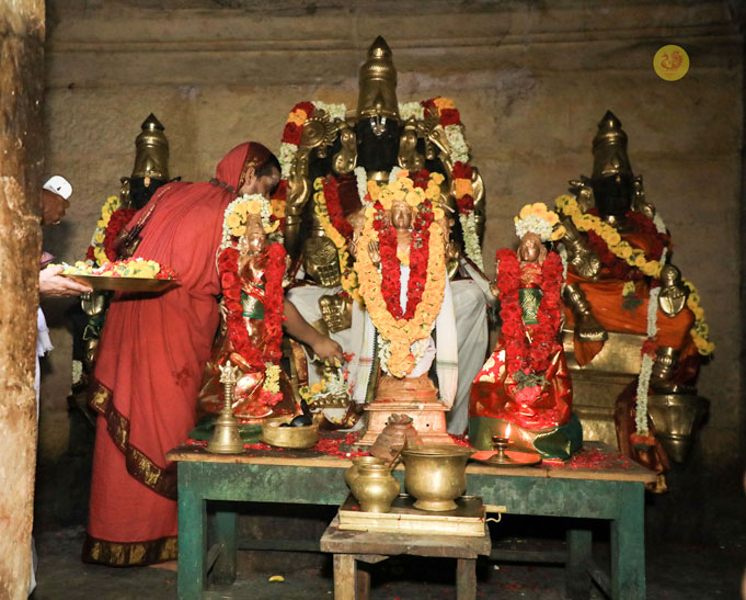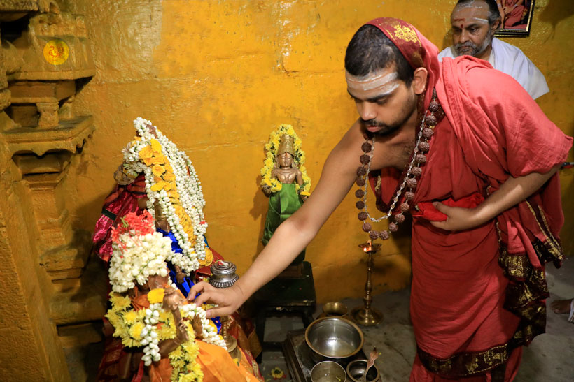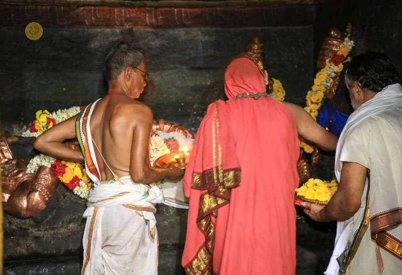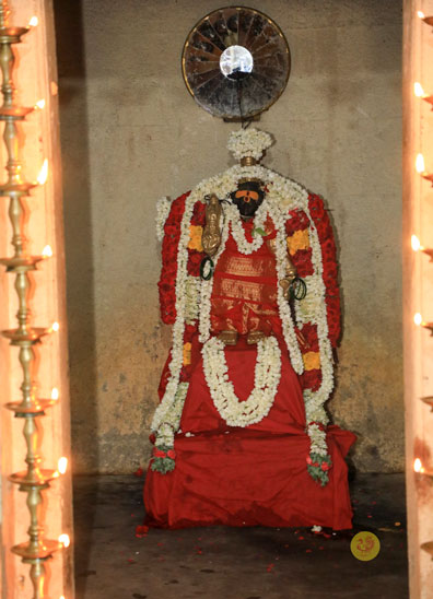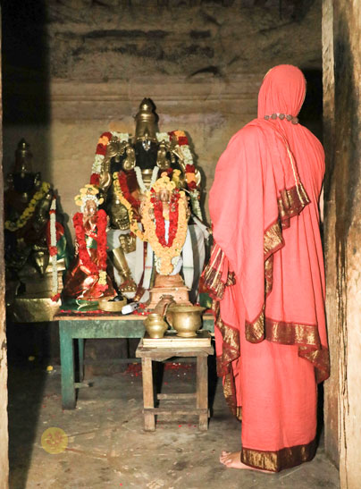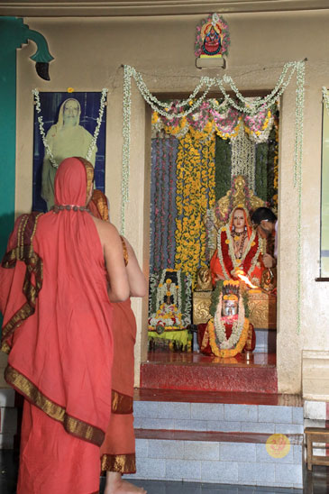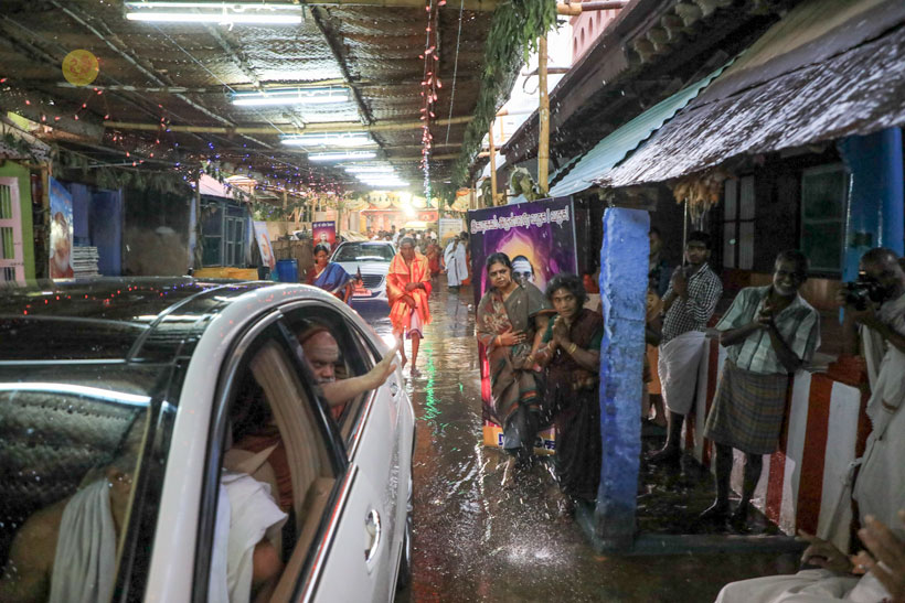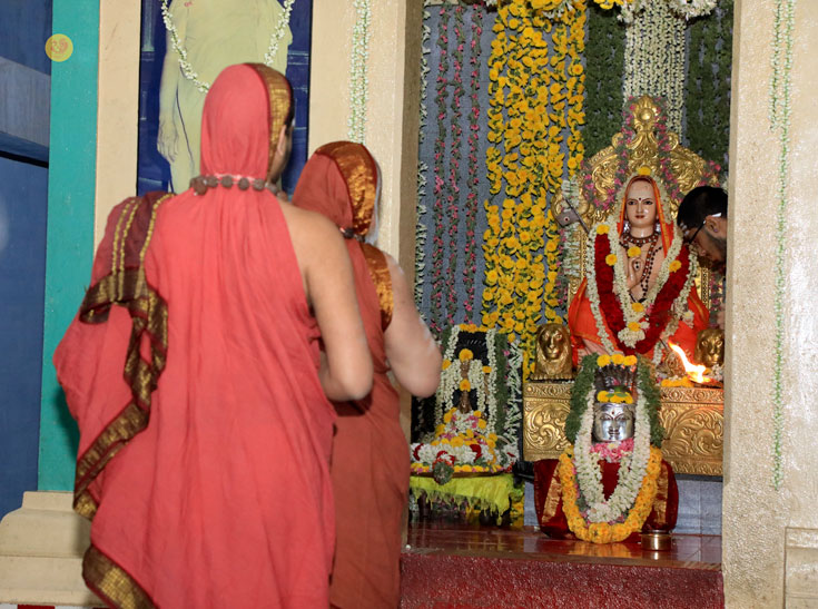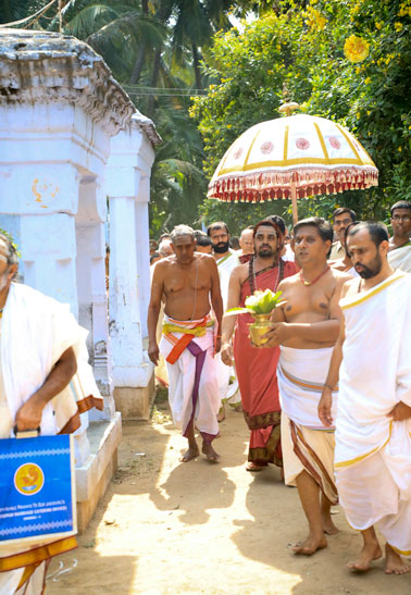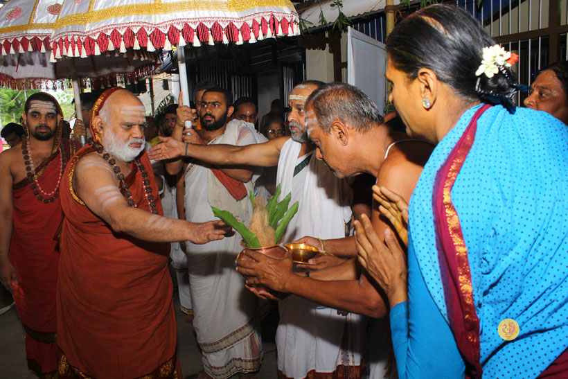 On April 20, 2017, Sri Sannidhanam offered Pooja in the morning at 6:30 at the shrine of Bhagavatpada in the Sringeri Shankara Math. At 9 am, Sri Sannidhanam visited the temples in the Melmangalam Agrahara namely those of Mayapandeeshwarar, Aahooya Varadarajaswamy, Pallikonda Perumal, and Sri Meenakshi Sundareshwarar. Later Sri Mahasannidhanam and Sri Sannidhanam gave Darshan and blessed devotees with Mantrakshata. Sri Sannidhanam also examined the Vidyarthis of the Pathashala. In the evening, the Jagadgurus blessed the management, Adhyapakas and Vidyarthis of the Pathashala and started from Melmangalam towards Vathalagundu.