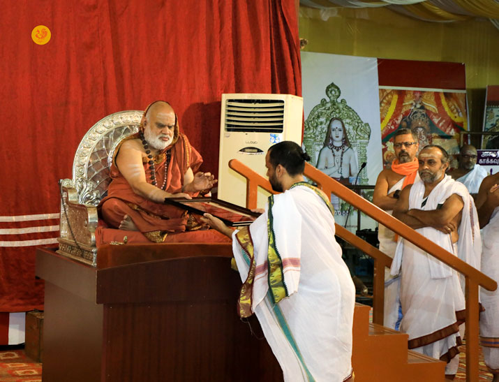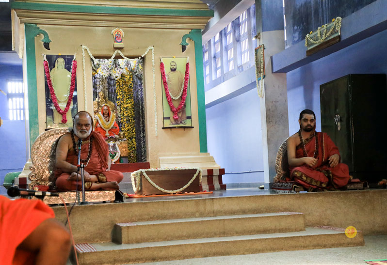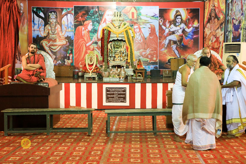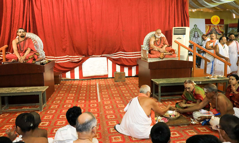 A Veda-Vedanta Sadas was held in Melmangalam in the divine presence of the Ubhaya Jagadgurus. Sri Mahasannidhanam inaugurated the Sadas in the Sringeri Shankara Math in front of the shrine of Bhagavatpada. Vidwan Mani Dravid gave a Vedanta Vakyartha in front of Sri Mahasannidhanam and Sri Sannidhanam. Following this, Vakyarthas in select Adhikaranams of the Brahmasutras by other Vidwans took place.
