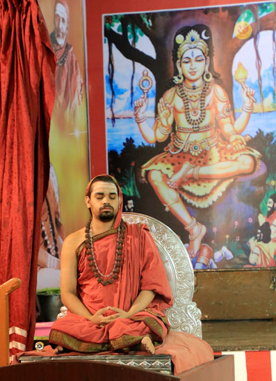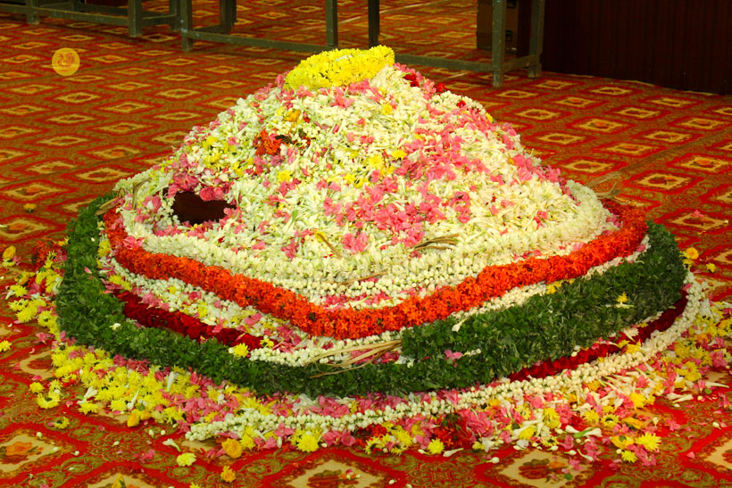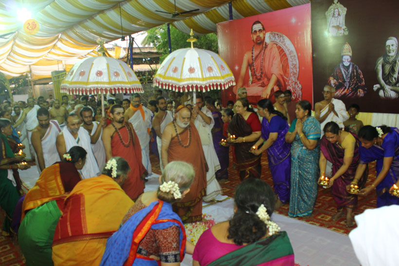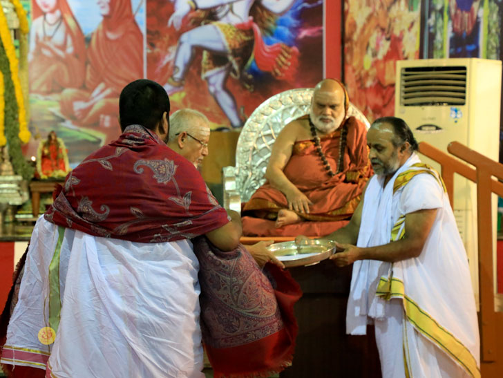 At 6 pm, Sri Mahasannidhanam graced the Sabha. Guru Vandana was performed with huge amounts of flowers being offered to the Padukas of Sri Mahasannidhanam amidst chants of the Sringeri Guru Parampara Stotram and the Guru Paduka Stotram.