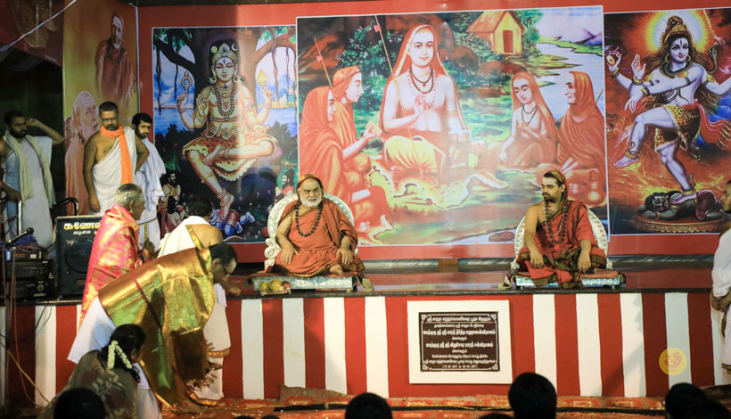 Sri Mahasannidhanam and Sri Sannidhanam arrived at the Agrahara of Melmangalam in the evening of April 18, 2017 to a reverential welcome. The Ubhaya Jagadgurus first had Darshan of Sri Adi Shankara Bhagavatpada at the Sringeri Shankara Math. Thereafter, the Jagadgurus graced a public function in the premises of the Pathashala of the Vidya Bharati Saanga Veda Paripalana Sabha at Melmangalam.