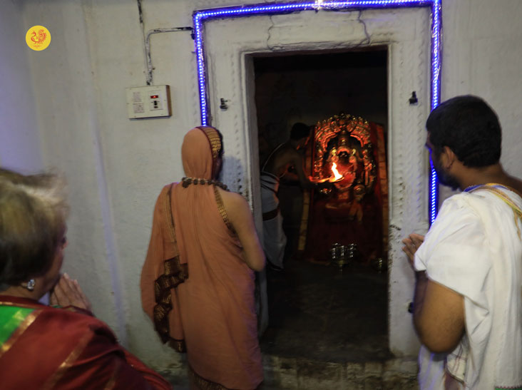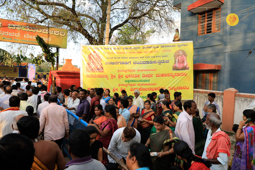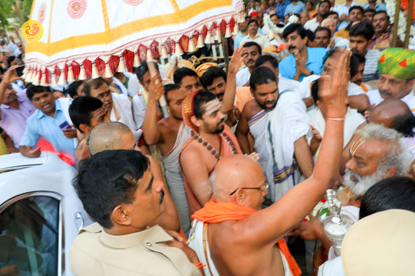 At around 4:30 pm, the Ubhaya Jagadgurus started from Mysuru towards Hebbasuru and enroute, blessed the devotees of Nanjangud assembled in the Sri Chamundeshwari temple in the outskirts of Nanjangud.