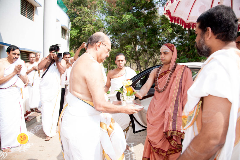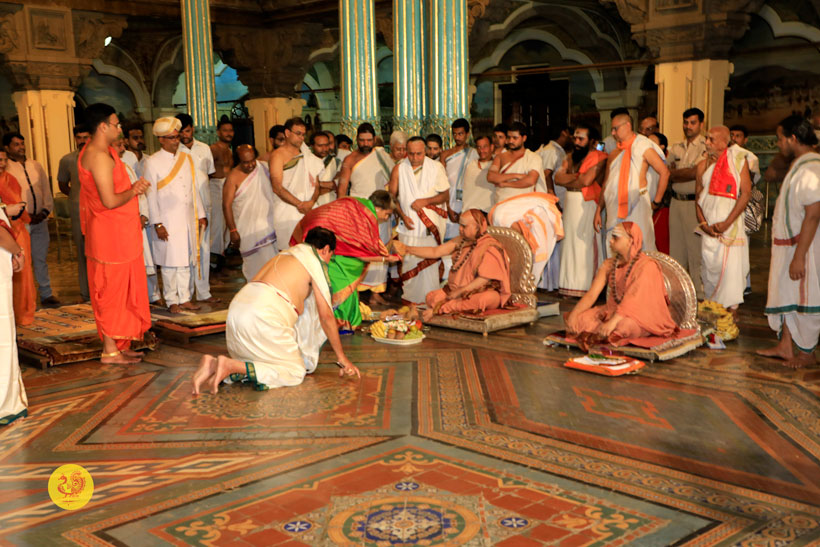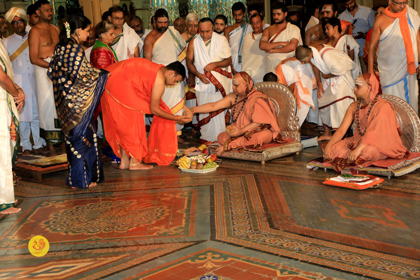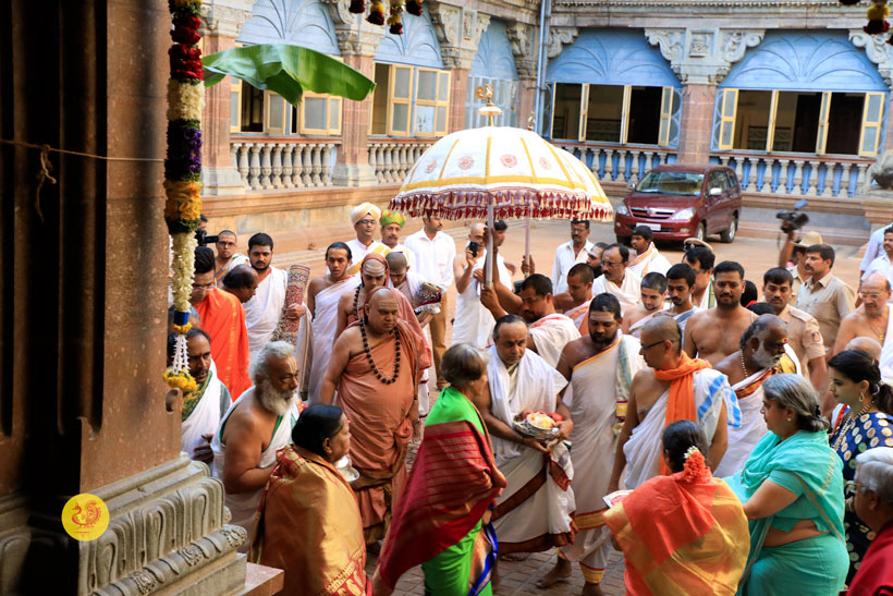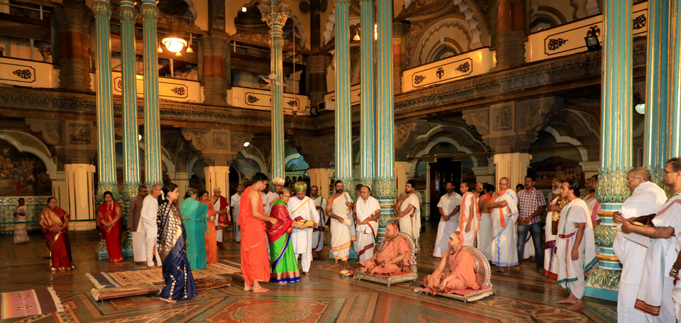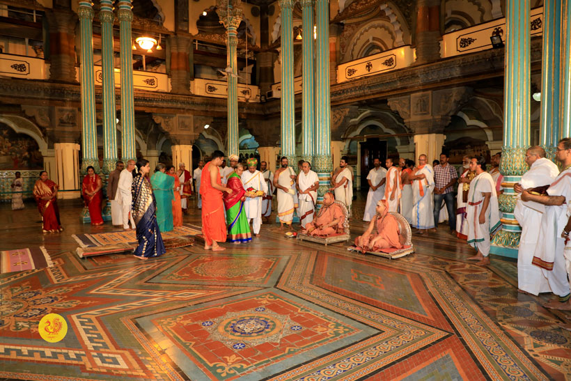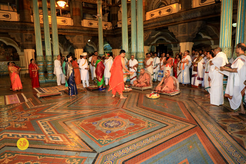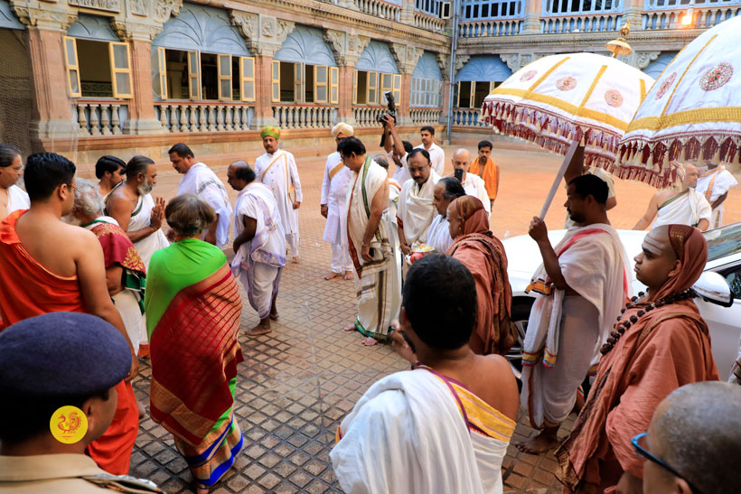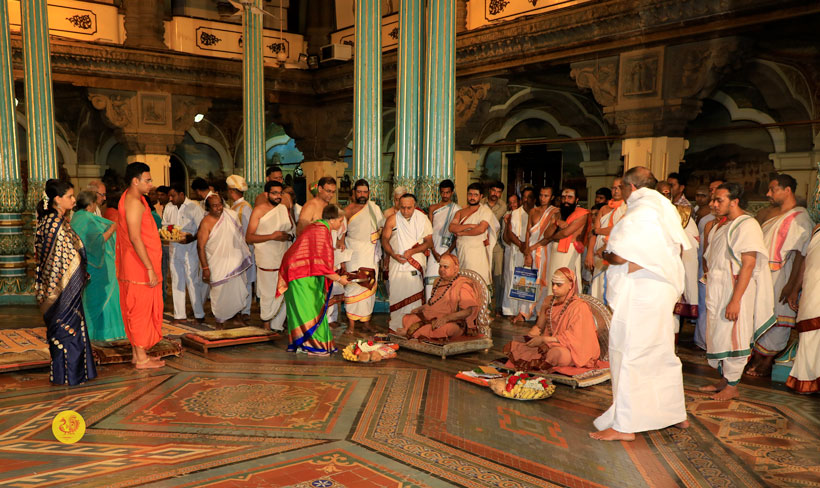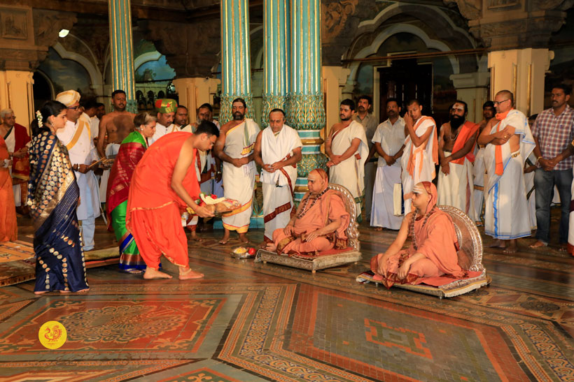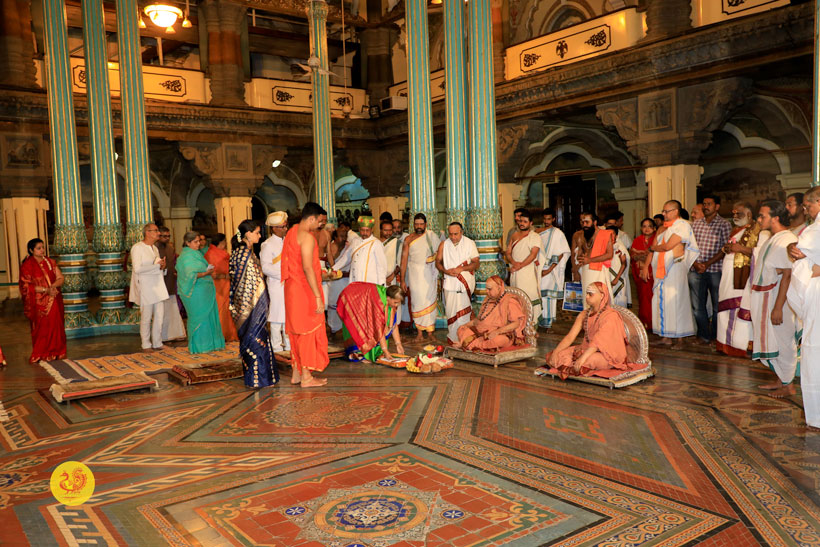 Jagadguru Shankaracharya Sri Sri Bharati Tirtha Mahasannidhanam and Jagadguru Sri Sri Vidhushekhara Bharati Sannidhanam arrived at Mysuru in the afternoon of March 11, 2017. The Ubhaya Jagadgurus were received with Poornakumbha Swagata at the entrance of the Sri Lakshmi Ramana temple inside the Mysuru Royal Palace. Rajamata Her Highness Pramoda Devi Wadiyar respectfully welcomed the Jagadgurus.