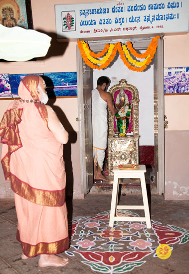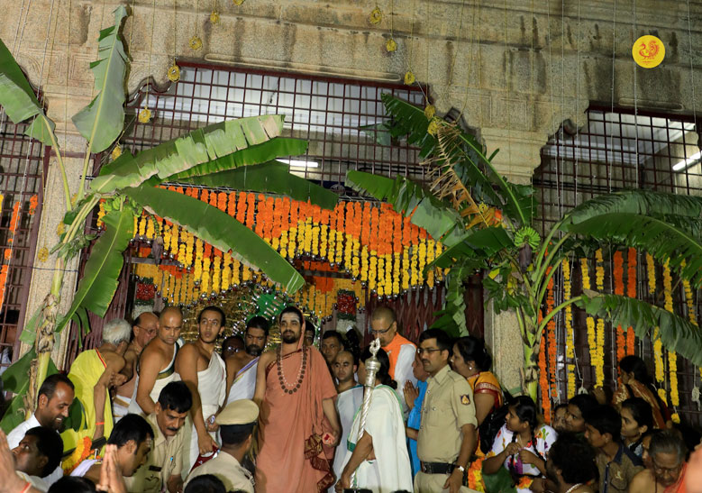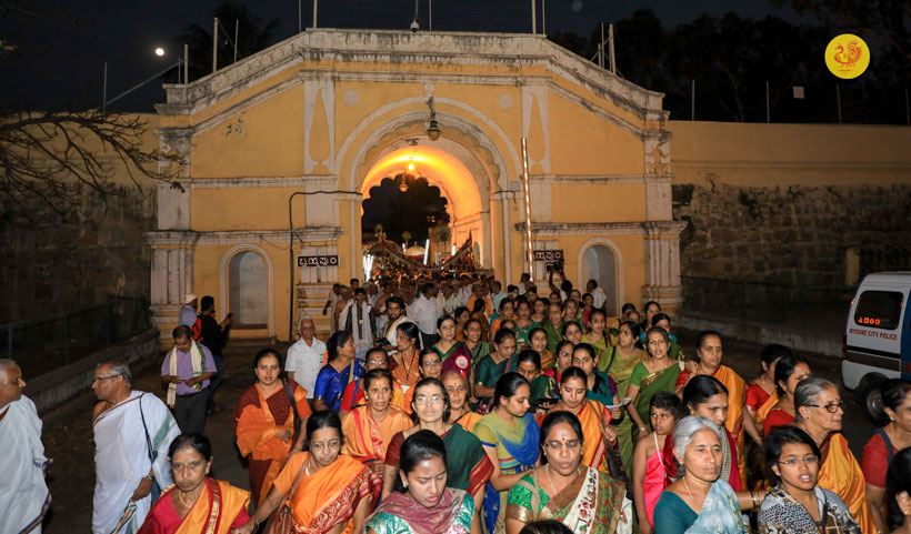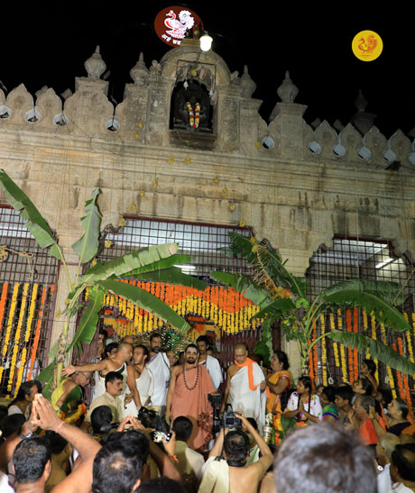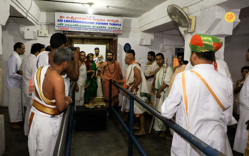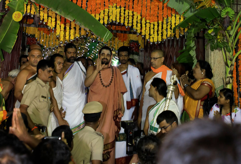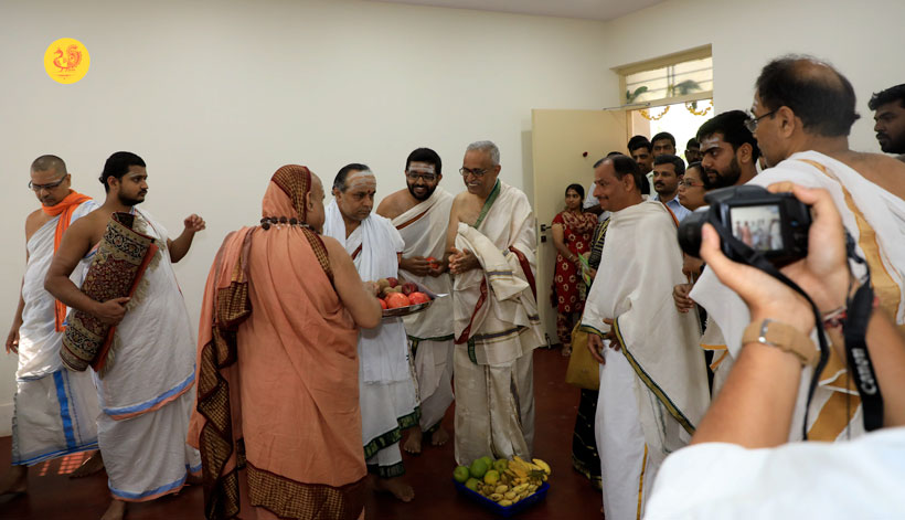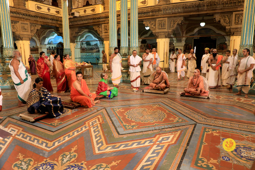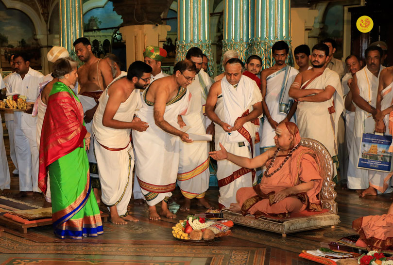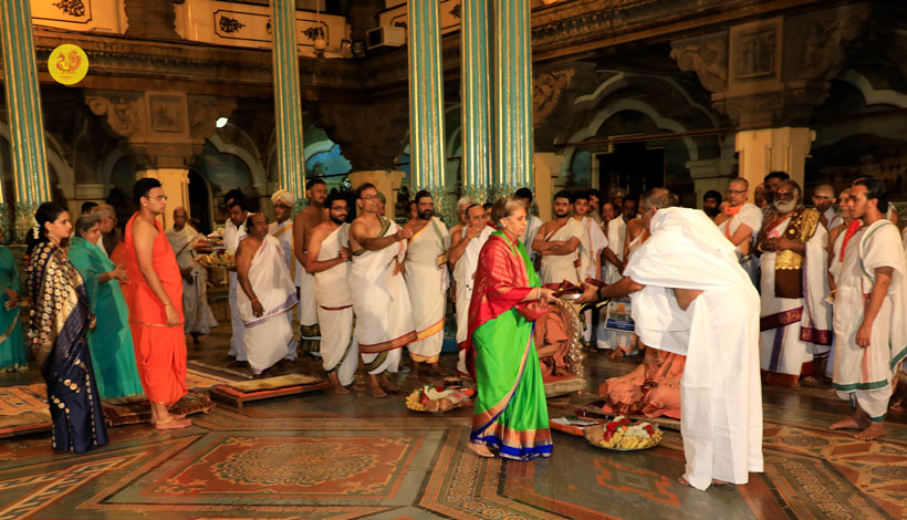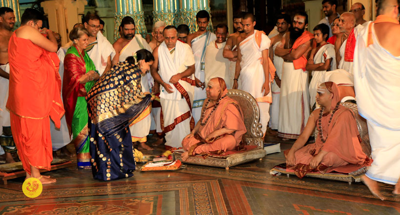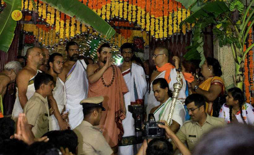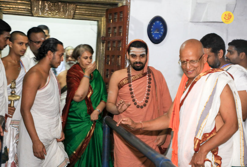 Jagadguru Shankaracharya Sri Sri Bharati Tirtha Mahasannidhanam and Jagadguru Sri Sri Vidhushekhara Bharati Sannidhanam arrived at Mysuru in the afternoon of March 11, 2017. The Ubhaya Jagadgurus were received with Poornakumbha Swagata at the entrance of the Sri Lakshmi Ramana temple inside the Mysuru Royal Palace. Rajamata Her Highness Pramoda Devi Wadiyar respectfully welcomed the Jagadgurus.