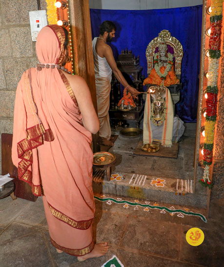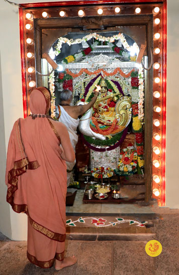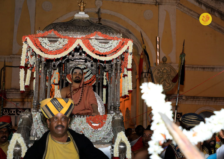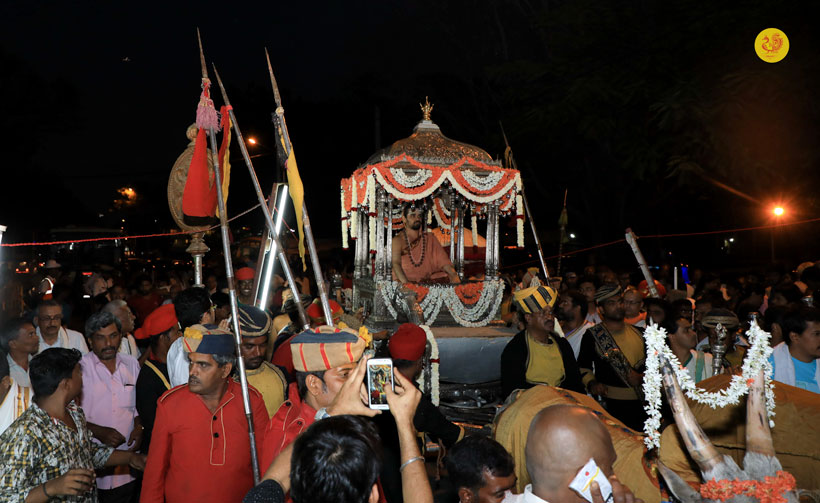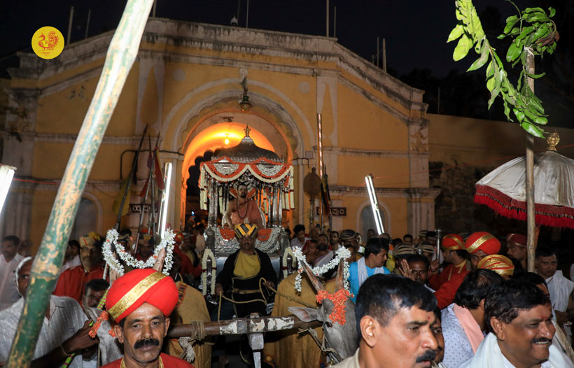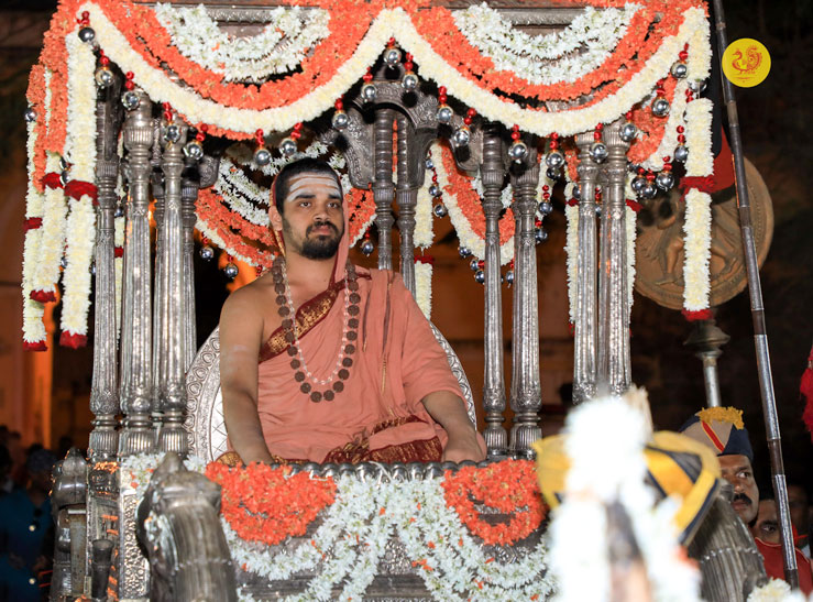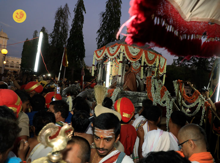 Sri Sannidhanam had Darshan of Sri Lakshmi Ramana Swamy and was led to the silver Ratha belonging to the Mysuru Royal Family. Gracing the silver Ratha, Sri Sannidhanam was joyfully led in a procession from the palace to the Abhinava Shankaralaya. On arrival in the premises, Sri Sannidhanam also had Darshan at the aforementioned shrines.