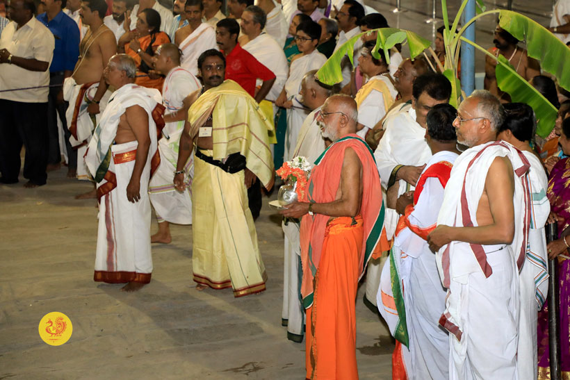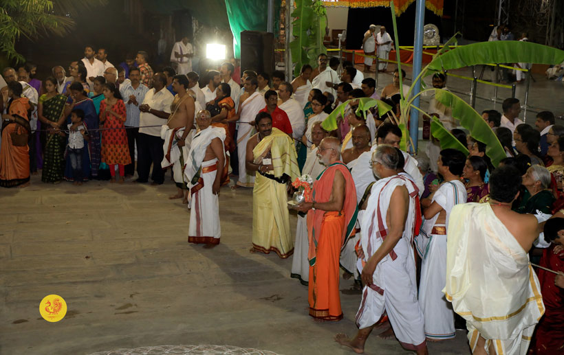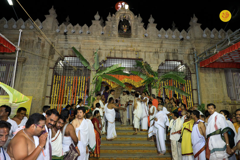 Recounting His first Yatra to Mysuru immediately after His own Sannyasa Sweekara, Sri Mahasannidhanam said that His Guru (Jagadguru Sri Abhinava Vidyatirtha Mahaswamiji) had started on a Yatra in early 1975 and had planned to travel via Hassan, Mysuru, Sathyamangalam, Karur and Madurai en route to Rameswaram to conduct the Kumbhabhisheka. At that time, Sri Mahasannidhanam had started on the Pushya Krishna Pratipat with the Kumbhabhisheka at Rameswaram set for Pushya Krishna Dashami. Consequently, he had decided to stay only for a couple of days in Mysuru, and had conveyed the same to the then Dharmadhikari, Sri P R Hariharan.