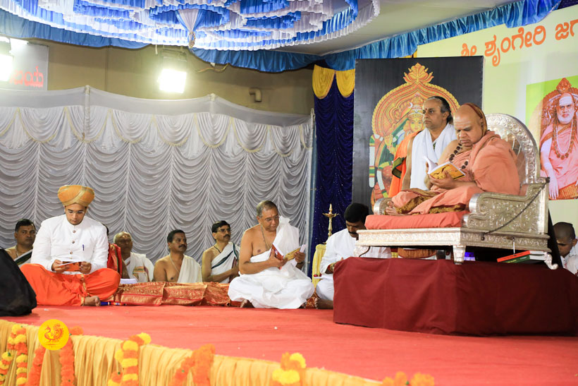 In His Anugraha Bhashanam, Sri Sannidhanam talked about the scholars of repute who have adorned the royal court of Mysuru and their respect towards the Sringeri Jagadgurus whom they regarded as “Sakshat Saraswati Swaroopa”. Sri Sannidhanam mentioned the names of erstwhile scholars such as Sri Kunigal Rama Shastri, Sri Lakshminarasimha Shastri (the elder son of the former), and Sri Mandikal Rama Shastri (who had witnessed the historic Kumbhabhisheka of Goddess Sharadamba in Sringeri in 1916 and had penned the “Kumbhabhisheka Champu” in Sanskrit).