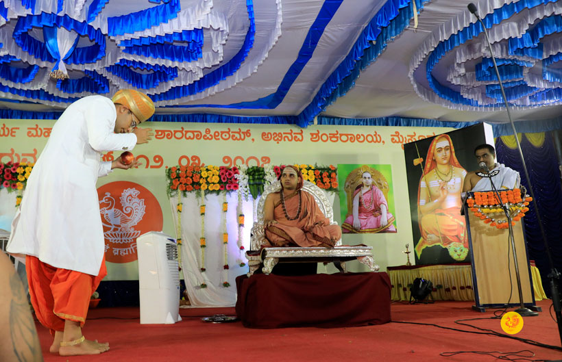 At around 7 pm, Sri Mahasannidhanam and Sri Sannidhanam graced the Guru Vandana event organized in the precincts of Abhinava Shankaralaya. The royal scion and titular Maharaja of Mysuru, His Highness Sri Yaduveera Krishnadatta Chamaraja Wodeyar, was the chief guest. The program began with Veda Ghosha followed by a rendition of “Sri Shankaracharyam Bhaje Re Maanasa Advaita-vidya-gurum” (a composition of Sri Mahasannidhanam). Vidwan H V Nagaraja Rao read out a Sanskrit citation in honour of the Jagadgurus. A Kannada citation (binnavattale) was read out, and was offered by the Mayor of Mysuru, Sri MJ Ravikumar. This was followed by Phala Samarpanam by various dignitaries, and representatives of various institutions and Maths, as well as people of different communities.