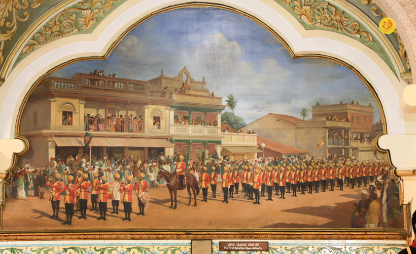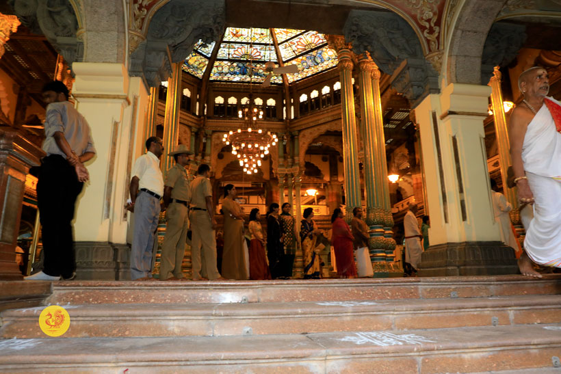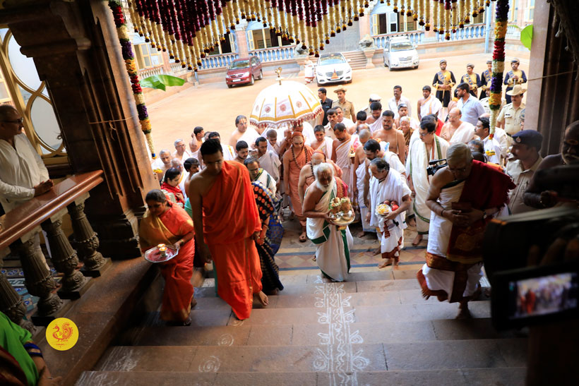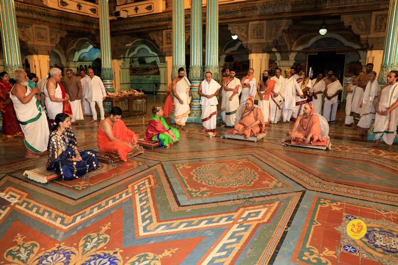 In the evening, Sri Mahasannidhanam and Sri Sannidhanam were received at the Amba Vilas Palace of the Mysuru Royal family. The royal scion and titular Maharaja of Mysuru, His Highness Sri Yaduveera Krishnadatta Chamaraja Wodeyar, and Rajamata Pramoda Devi Wodeyar reverentially offered a traditional welcome to Sri Mahasannidhanam and Sri Sannidhanam at the entrance of the palace, and led Them in.