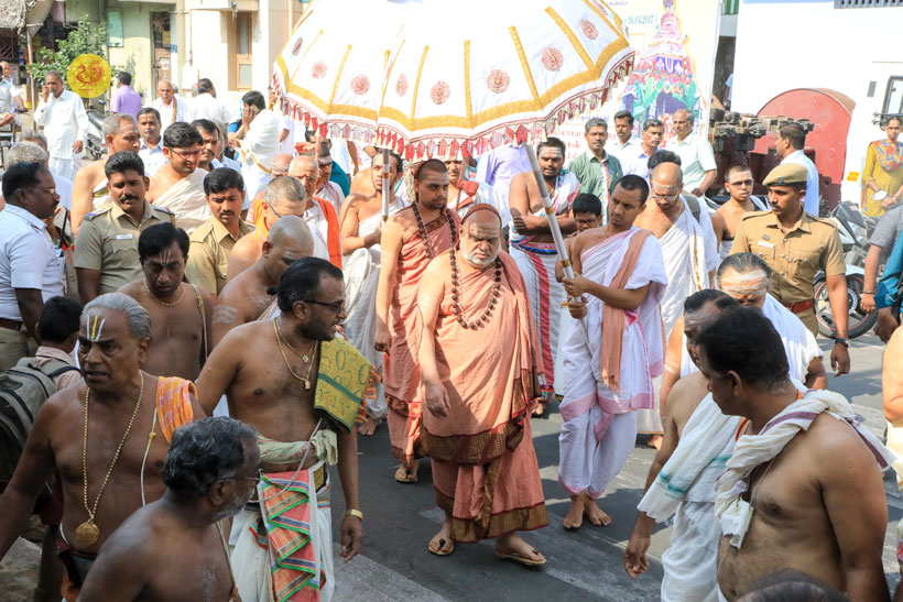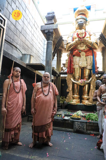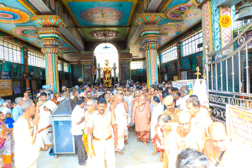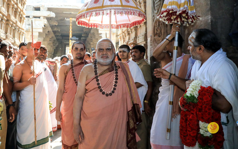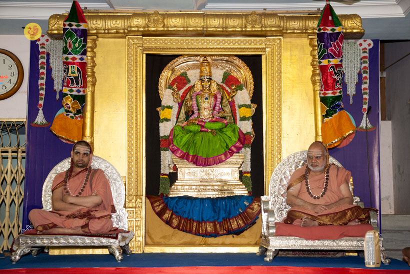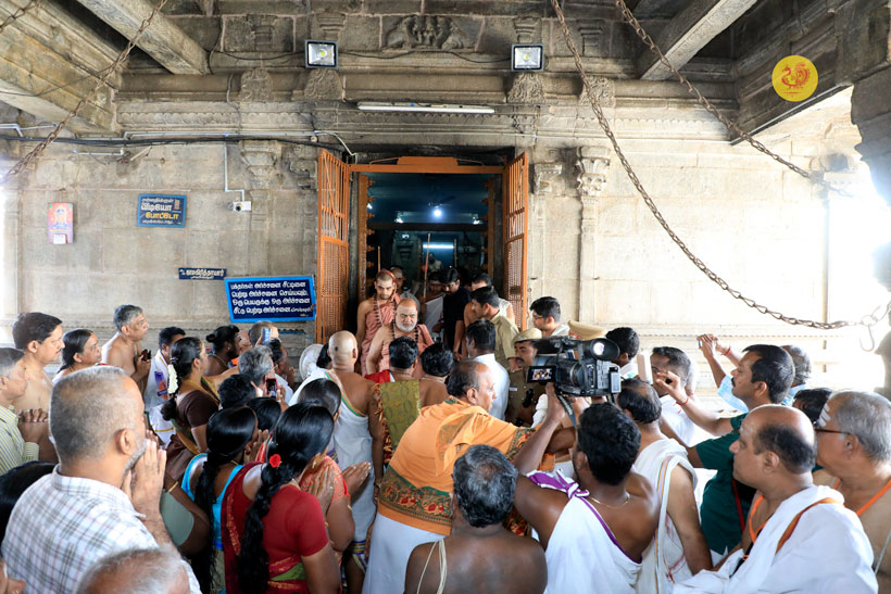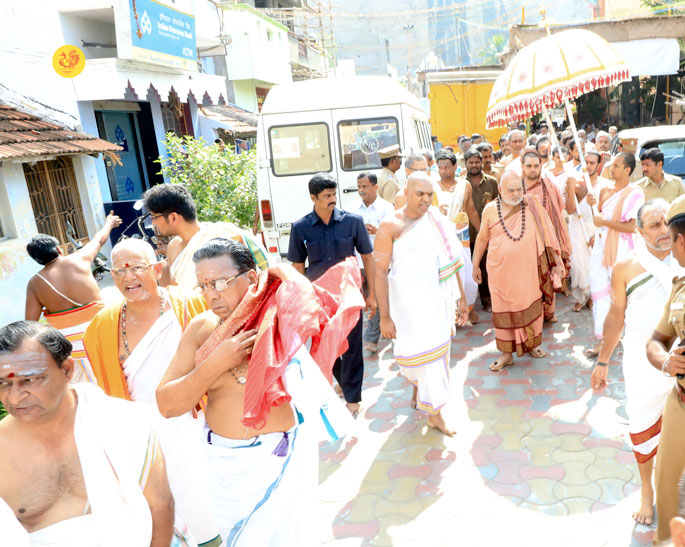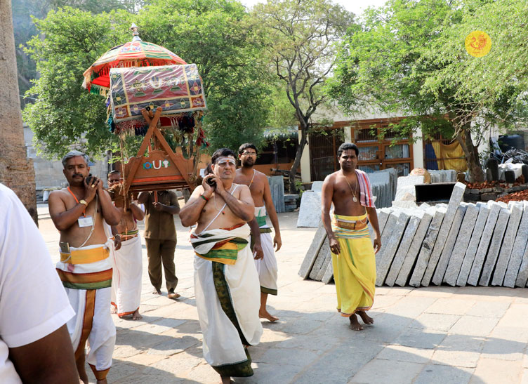On March 23, Sri Mahasannidhanam and Sri Sannidhanam were led in a procession on foot, first to the Narasimha Swamy temple. They had Darshan of Goddess Namagiri and Lord Narasimha. Thereafter, the Jagadgurus proceeded towards the Anjaneya Swamy temple at Namakkal and had Darshan. Later, Sri Sannidhanam visited the Vasavi Kannika Parameshwari temple in Namakkal town, had Darshan and blessed the devotees with an Anugraha Bhashanam. The Ubhaya Jagadgurus blessed devotees with Darshan, Tirtha Prasada and Ashirmantrakshatras and left for Dindigul in the afternoon.