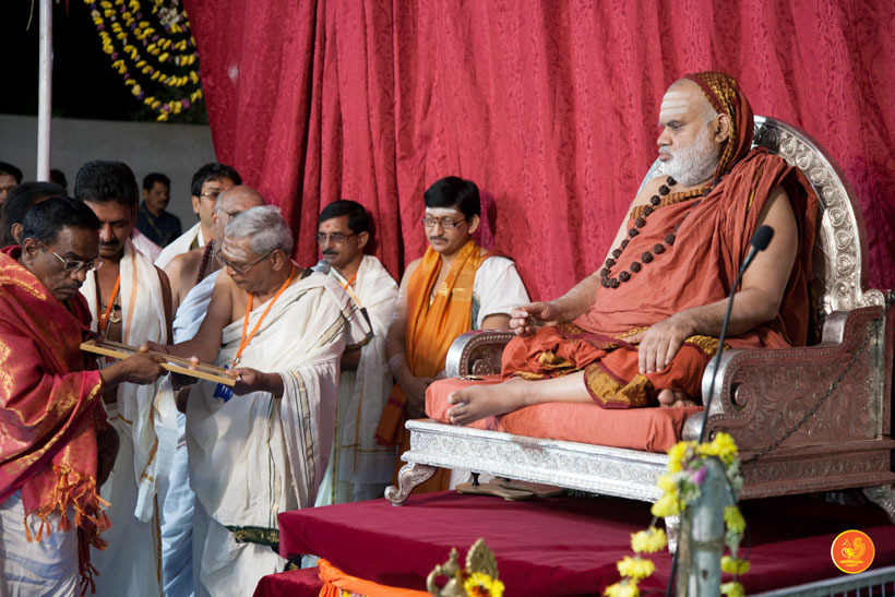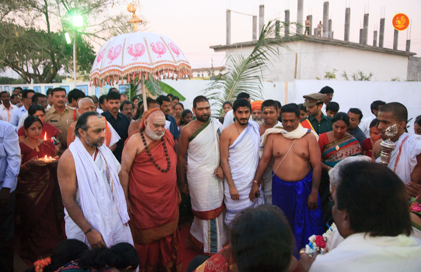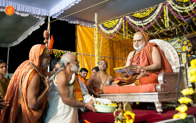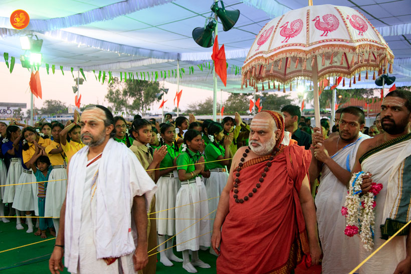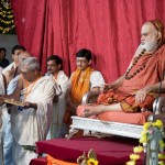 Jagadguru Shankaracharya Sri Sri Bharati Tirtha Mahaswamiji arrived at Nirmal on the evening of December 25th. After the Dhuli Pada Puja was performed and Swagata Patrika was offered, the Jagadguru blessed the gathering with a Anugraha Bhashanam.