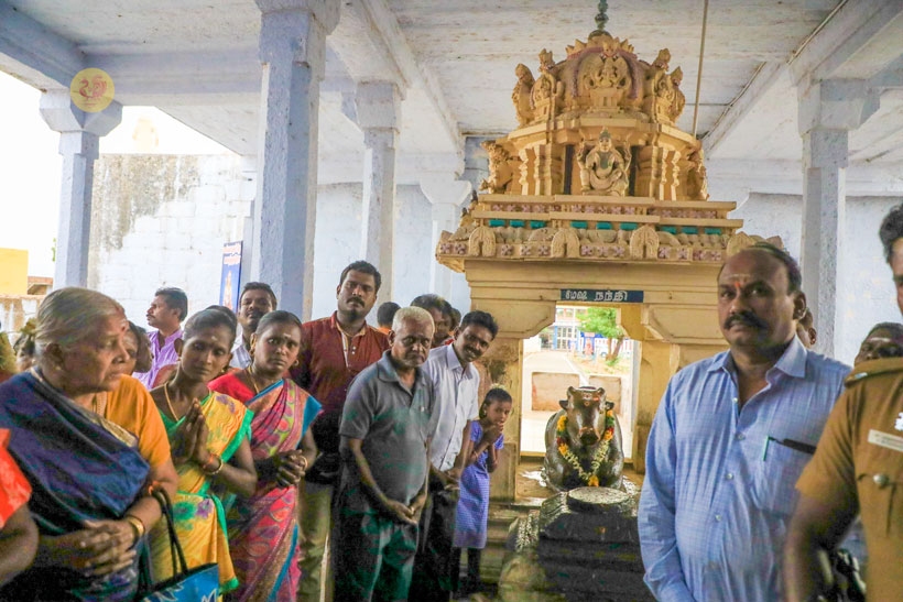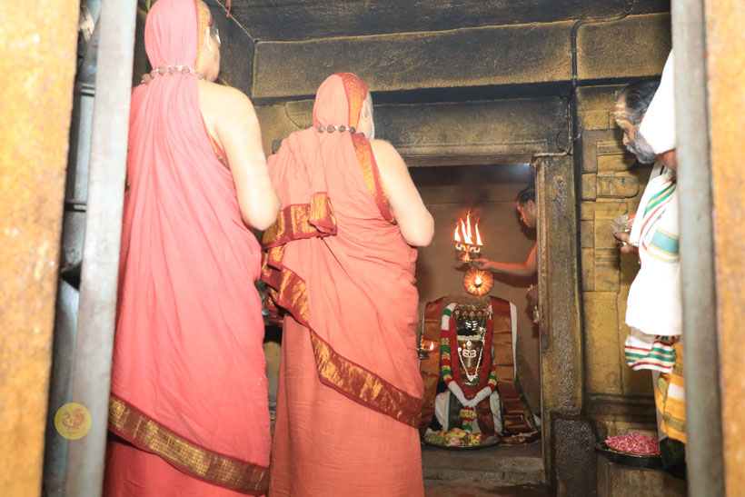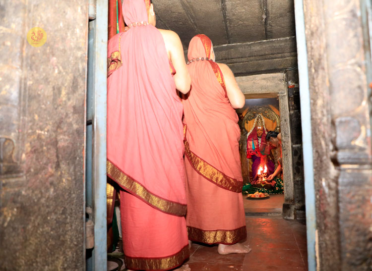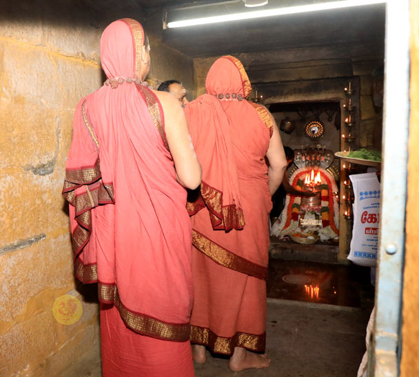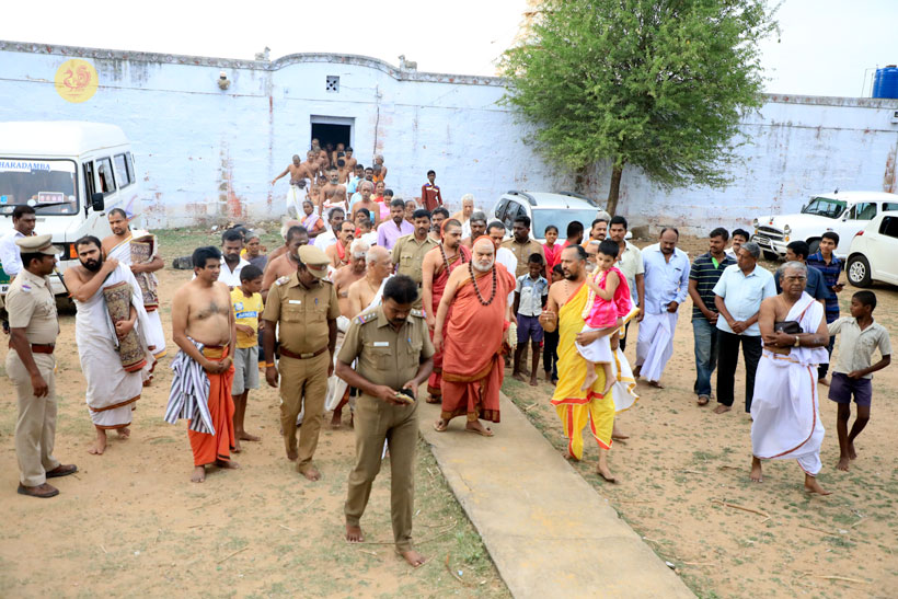 After blessing devotees with Darshan and Mantrakshata later in the morning, the Jagadgurus started for Ramayyanpatti in the evening. En route, the Jagadgurus graced Melnattham and had Darshan at the Gomati Ambal Sameta Agneeshwarar temple and the Shasta temple.