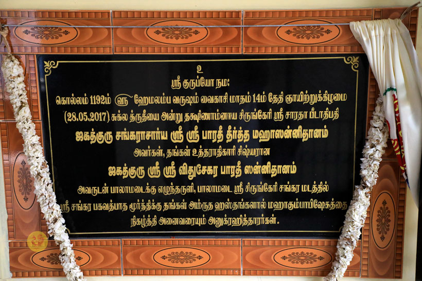 On May 28, 2017, Sri Sannidhanam performed the Kumbhabhisheka at the shrine of Sri Adi Shankaracharya at the Sringeri Shankara Math in Palamadai.