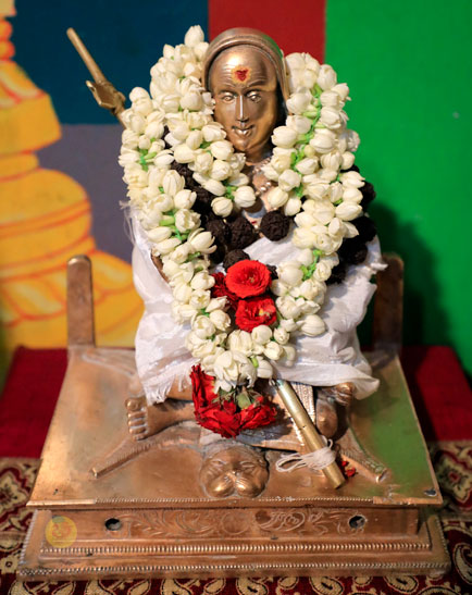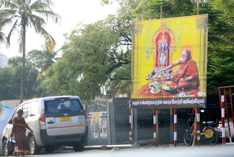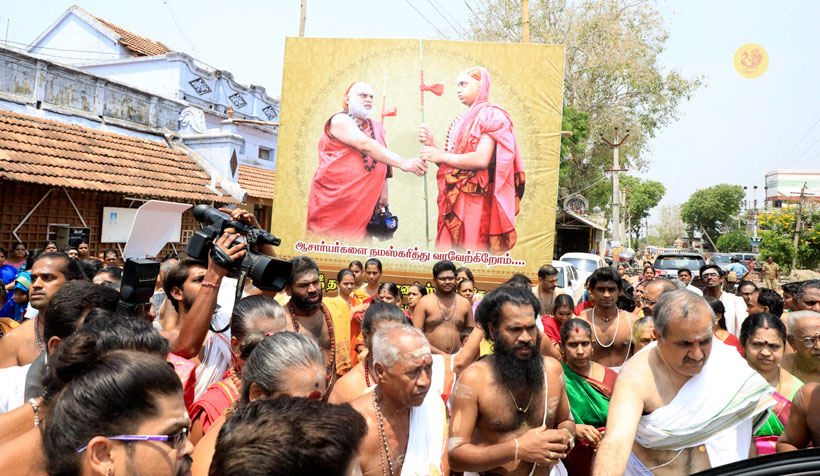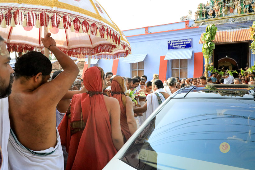Sri Mahasannidhanam and Sri Sannidhanam then granted Darshan to devotees. Starting towards Udumalaipettai in the afternoon, the Ubhaya Jagadgurus graced Kalayamputtur en route. Sri Sannidhanam first had Darshan at the Kalyani Amman Sameta Kailsanatha Swamy temple. Sri Mahasannidhanam blessed the assembled devotees with an Anugraha Bhashanam. Sri Mahasannidhanam commended the residents of the town for devotedly conducting the Shankara Jayanti Celebrations every year.