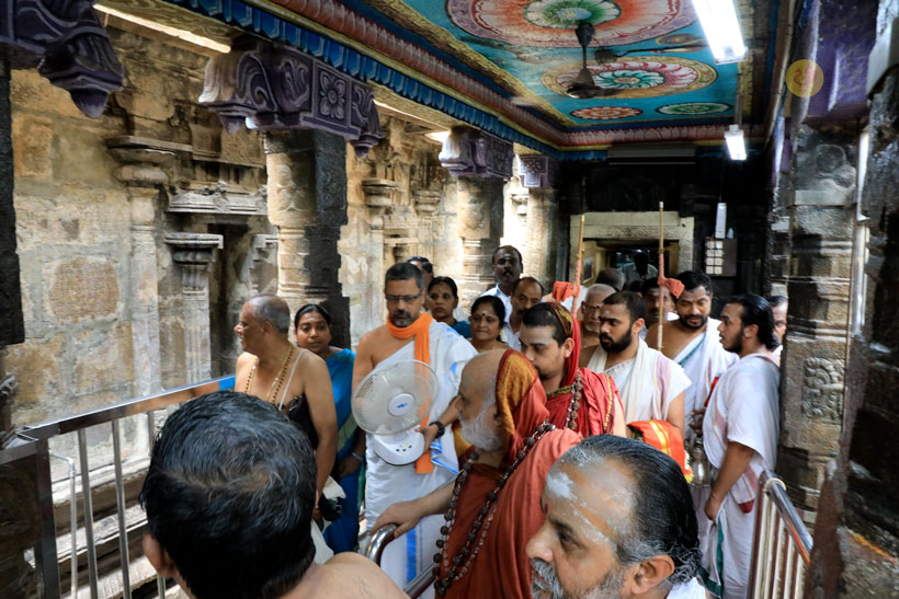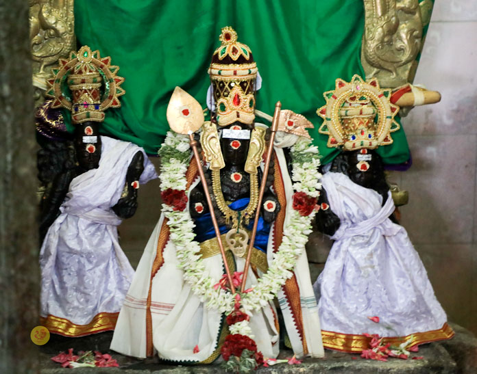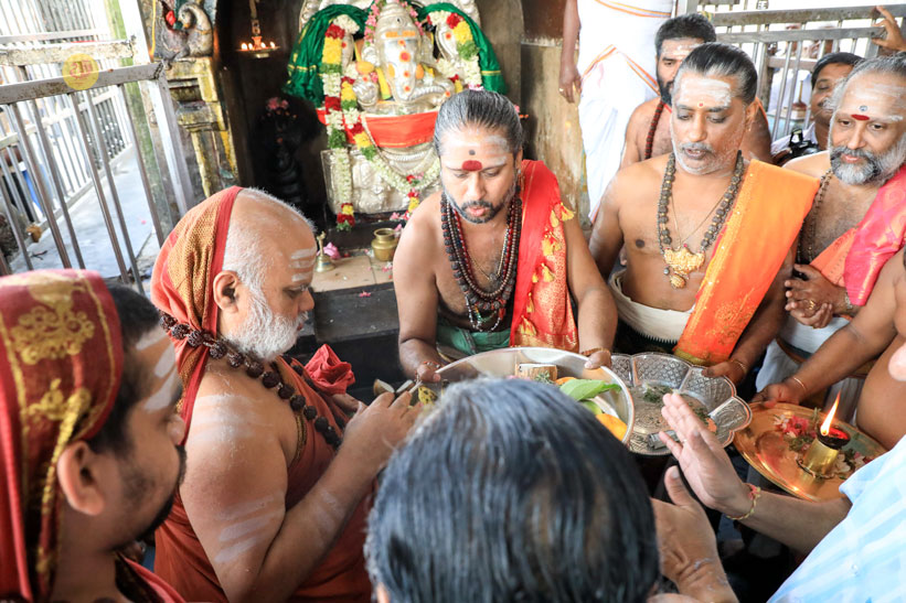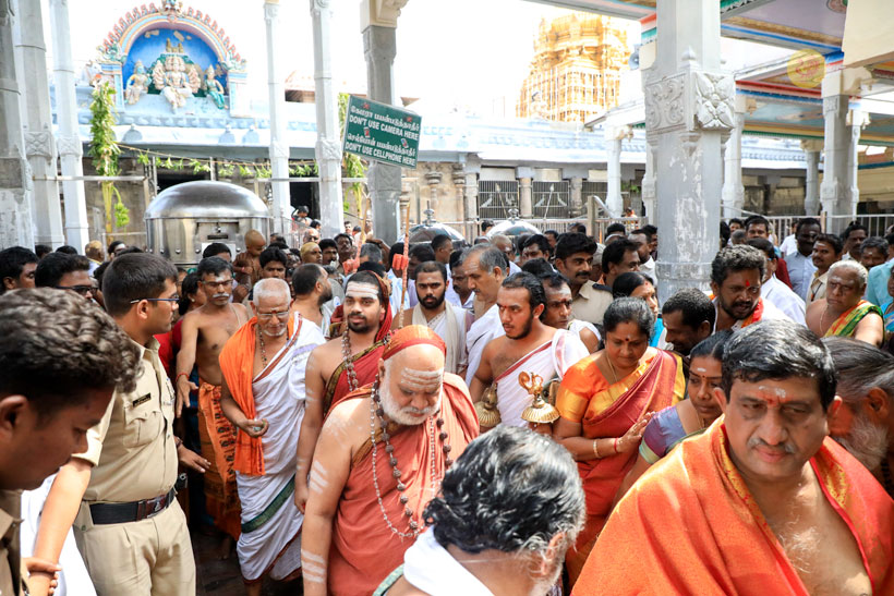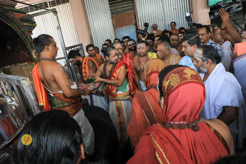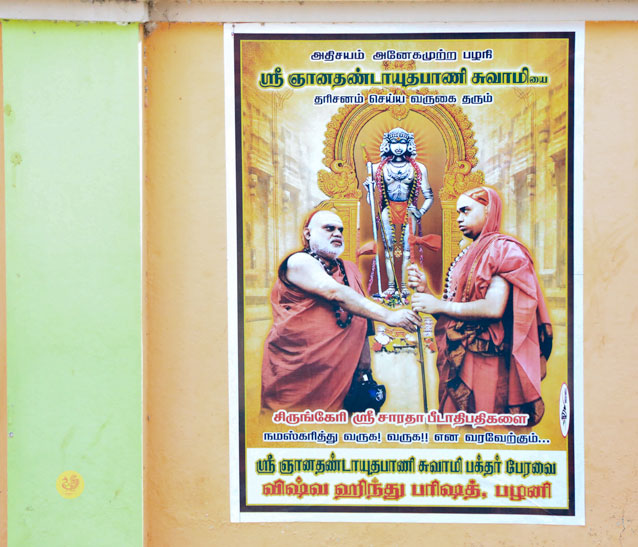 At around 8:15 am on April 23 morning, Sri Mahasannidhanam and Sri Sannidhanam arrived at the temple complex of Sri Dandayudhapani Swamy temple. The Jagadgurus were received with traditional Poornakumbha Swagata by the Joint Commissioner of the temple and the Sthanika Archakas led by Sri Shiva Shanmukha Gurukkal and Sri Selva Subrahmanya Gurukkal. The Jagadgurus had Darshan of Sri Ananda Vinayakar and offered a Vastram. Soon afterwards, the Jagadguru entered the main temple complex via the southern Rajagopuram. At around 8:45 am, the Jagadgurus entered the Garbha Grin of Sri Dandayudhapani Swamy at first performed Pooja to Sharadamba Chandramoulishwara Shiva Linga. The Jagadgurus then performed the Kala Sandhi Pooja to Lord Dandayudhapani Swamy. As part of the Kala Sandhi Pooja, the Jagadgurus did Abhisheka first to the Utsava Moorti and then to the main deity (Moolavar) of Sri Dandayudhapani Swamy with thailam, panchamrita, milk, vibhuti and theertham. The Archakas then decorated the deity with the Vastrams offered by the Sringeri Math to the Lord. Sri Mahasannidhanam and Sri Sannidhanam then performed Archana to Sri Dandayudhapani Swamy. The Jagadguru then offered Dhoopa, Deepa, Neivedya and Mahamangalarati to Sri Dandayudhapani Swamy. After the Pooja, the Thakkaar of the temple and the Archakas offered the Prasadams to the Jagadgurus. The Jagadgurus descended from the Palani hill after blessing the officials of the temple headed by the Joint Commissioner.