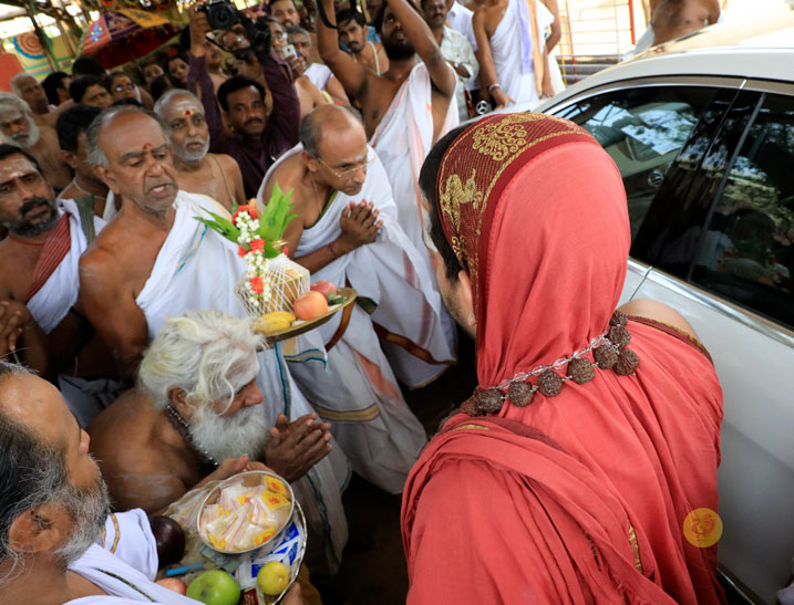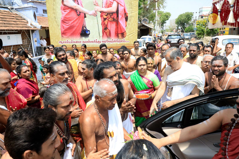 Arriving at the renowned Subrahmanya Swamy Kshetram of Palani in the evening of April 22, 2017, Sri Mahasannidhanam and Sri Sannidhanam were accorded a reverential welcome. Dhuli Pada Pooja was performed by the family of Sri Hariharamuthu. This was followed by Veda Ghosha. Swagata Patrikas extolling the greatness of the Sringeri Jagadgurus and the association between Sringeri and Palani were then read out in Sanskrit and Tamil, and offered to the Jagadgurus.